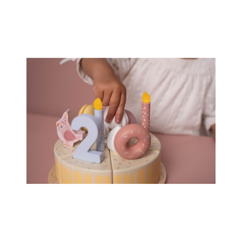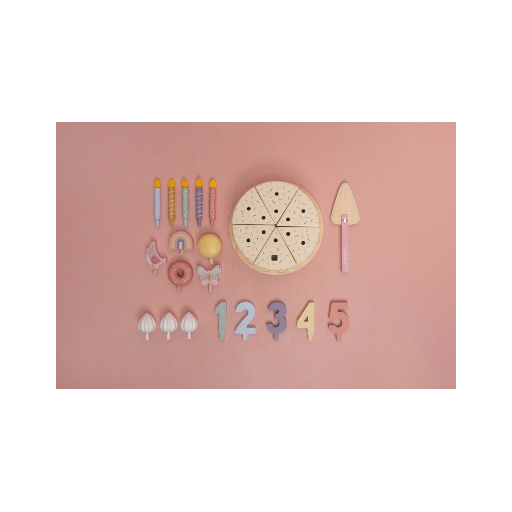 Sada s tortou v krásnom drevenom prevedení obsahuje 6 kúskov torty, 8 odnímateľných zdobení, 5 číslic, 5 sviečok, tanier na tortu a servírovaciu lopatku.