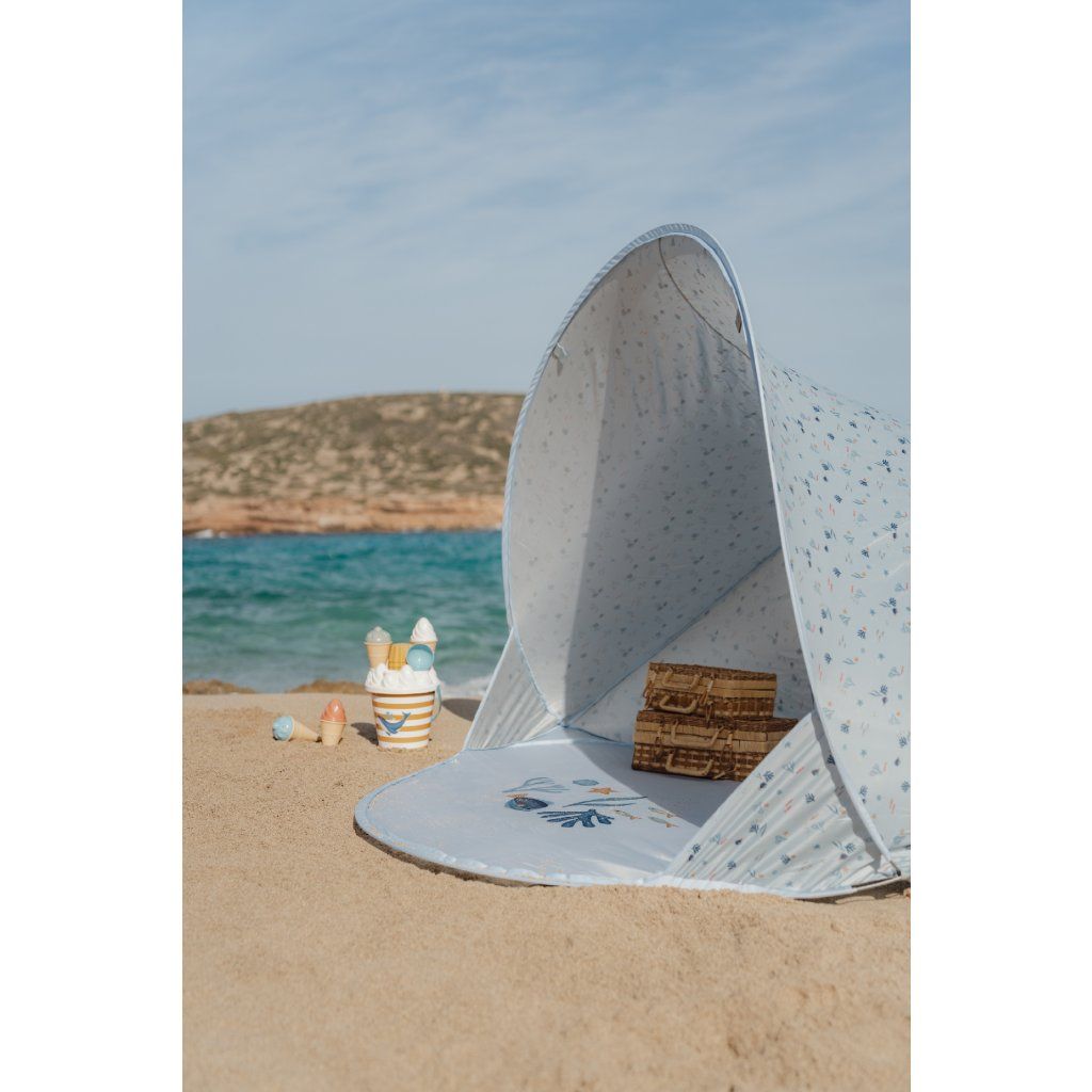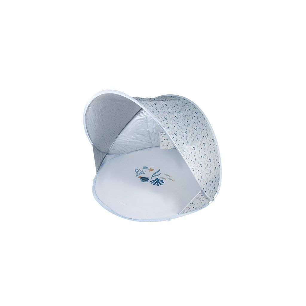 Prenosný skladací stan s UV faktorom 40+ na ochranu dieťaťa pred slnkom na záhrade, na pláži či na výletoch do prírody. Stan umožňuje jednoduchú ventiláciu vďaka zadnému okienku na zips. Dve vrecká na vnútornej stene ponúkajú priestor na uloženie drobností.