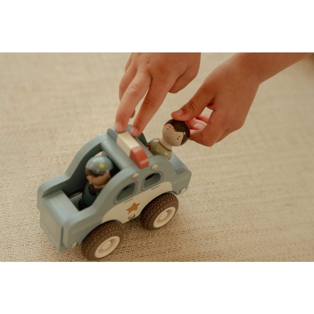 Stala sa nehoda alebo krádež? Drevené policajné auto sviští ulicami mesta priamo na miesto činu! S odvážnym policajtom za volantom a gumovými pneumatikami pre tichý a plynulý pohyb je pripravené chrániť a pomáhať.