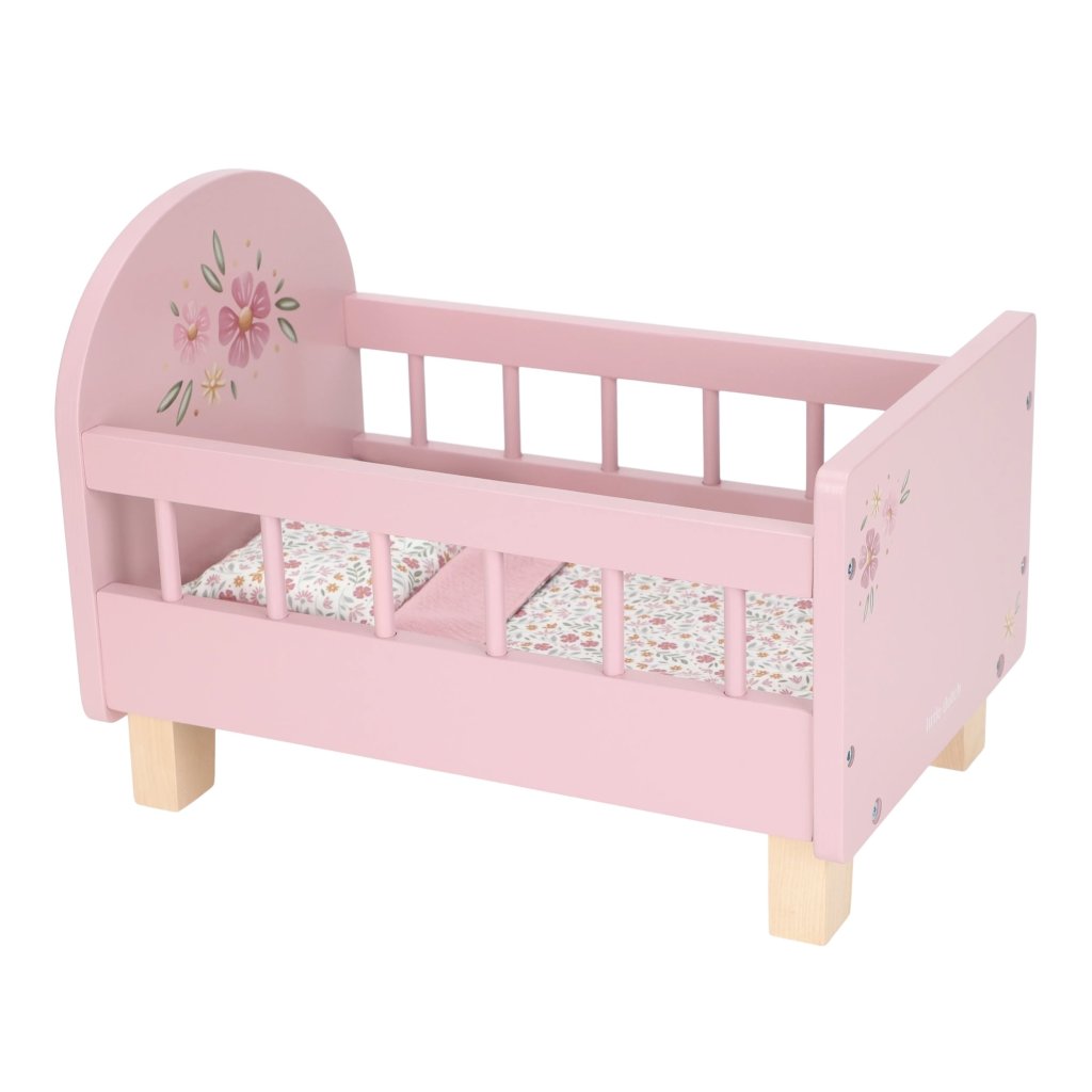 V tejto krásnej drevenej postieľke bude každá bábika spať mäkko a pohodlne. Súčasťou je mäkučký vankúšik, hrejivá perinka a matrac - všetko zladené v kúzelnom kvetinovom dizajne. Elegantné nôžky v prírodnej farbe a jemná kvetinová ilustrácia dodávajú postieľke romantický nádych a robia z nej nádherný doplnok každej izbičky.
