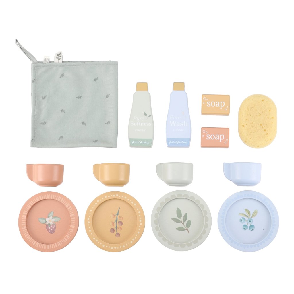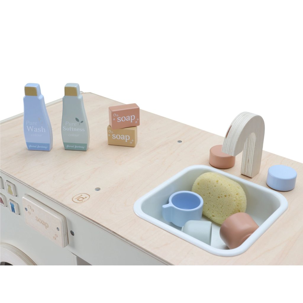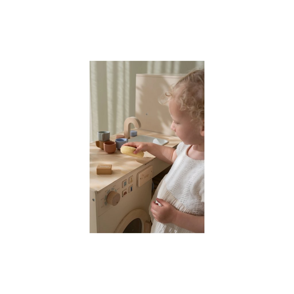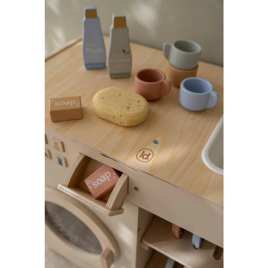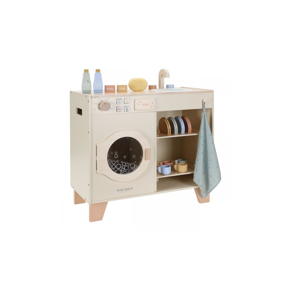 Štýlový drevený set práčky a drezu Little Dutch poteší každé dieťa, ktoré sa rado stará o svoje bábiky či plyšáky. V práčke im vyperie ich oblečenie, v dreze umyje riad, na ktorom servírovalo bábikám desiatu. Vďaka otočným gombíkom, tlačidlám aj vysúvacej priehradke na prací prostriedok pôsobí práčka aj drez realisticky a podnecujú deti k napodobňovaniu domácich prác. Súčasťou balenia je bohaté príslušenstvo: štyri šálky, štyri podšálky, špongia, prací prostriedok, mydlové kocky a látková utierka.