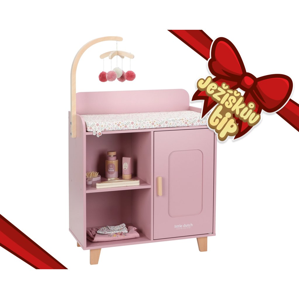 Elegantný prebaľovací pult Little Dutch umožňuje deťom napodobňovať každodennú starostlivosť o bábätko a starať sa o bábiky rovnako, ako sa mamička či otec starajú o svoje bábätko. Súčasťou balenia je mäkká prebaľovacia podložka s romantickou kvetinovou potlačou, závesný kolotoč, spací vak, textilná plienka, dve ramienka a drevené doplnky pre starostlivosť o bábiku. Praktická skrinka a poličky v spodnej časti prebaľovacieho pultu umožňujú mať všetko potrebné pre starostlivosť o bábiku vždy po ruke a upratané.