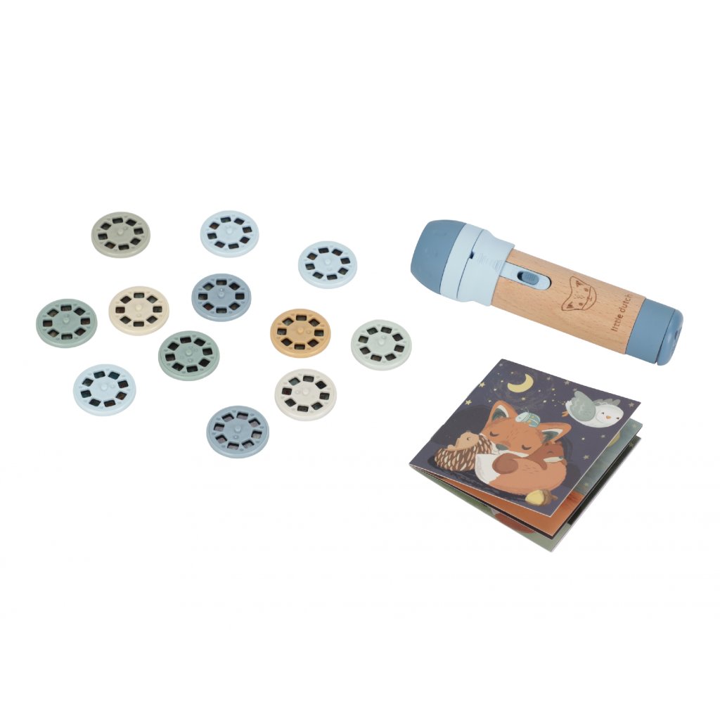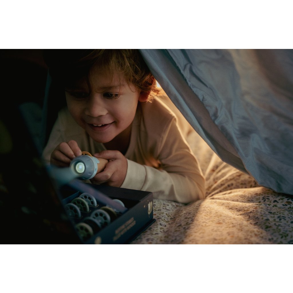 Projektor má pevnú drevenú rukoväť a funguje na batérie, takže si ho deti môžu vziať kamkoľvek so sebou. Po skončení príbehu je možné baterku aj všetko príslušenstvo ľahko uložiť do krásneho úložného boxu. Ideálny pre upokojujúci rituál pred spaním alebo príjemné spoločné chvíle.