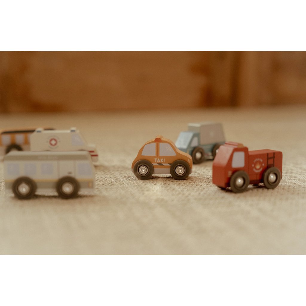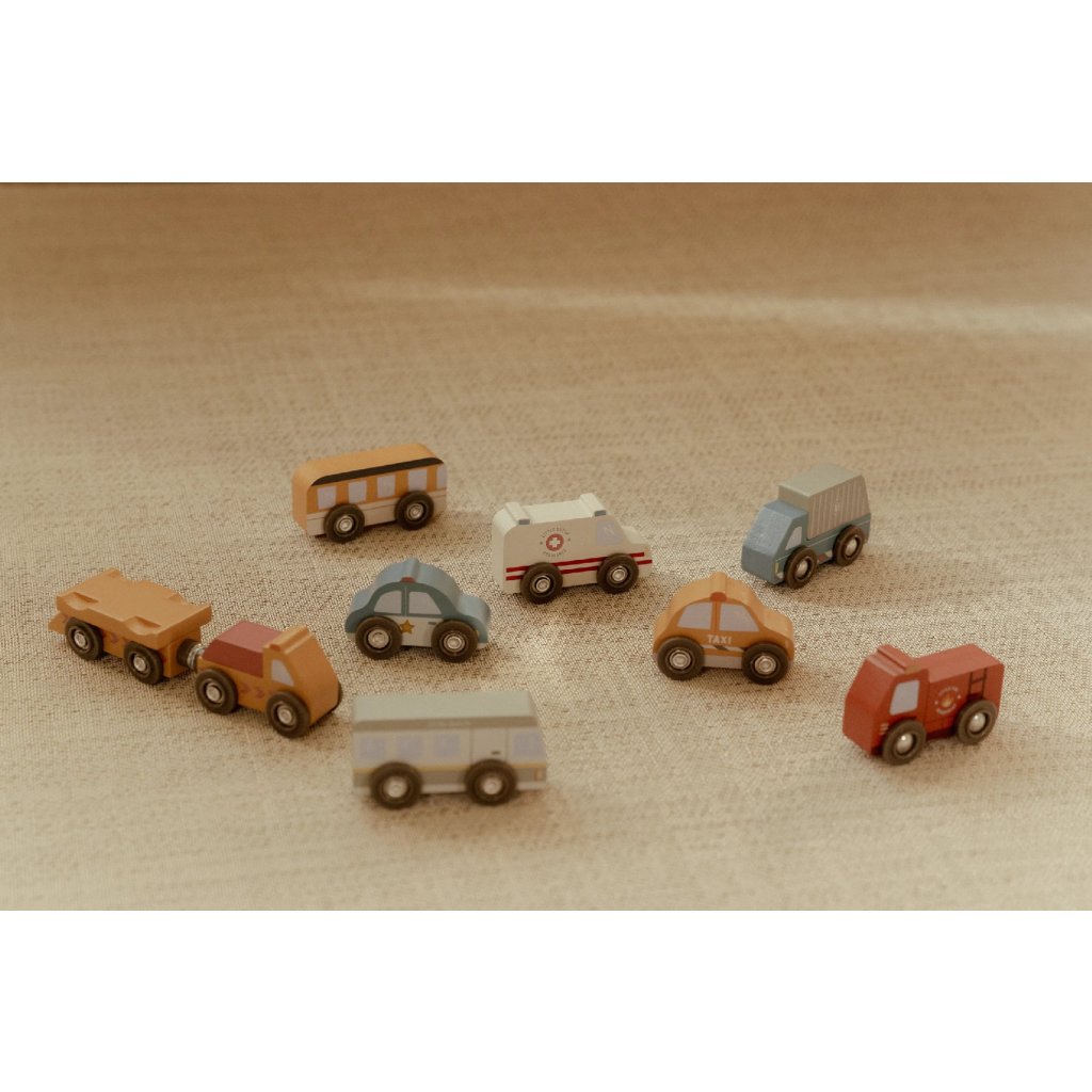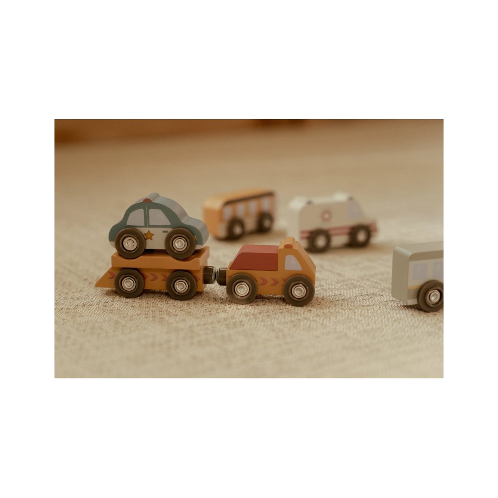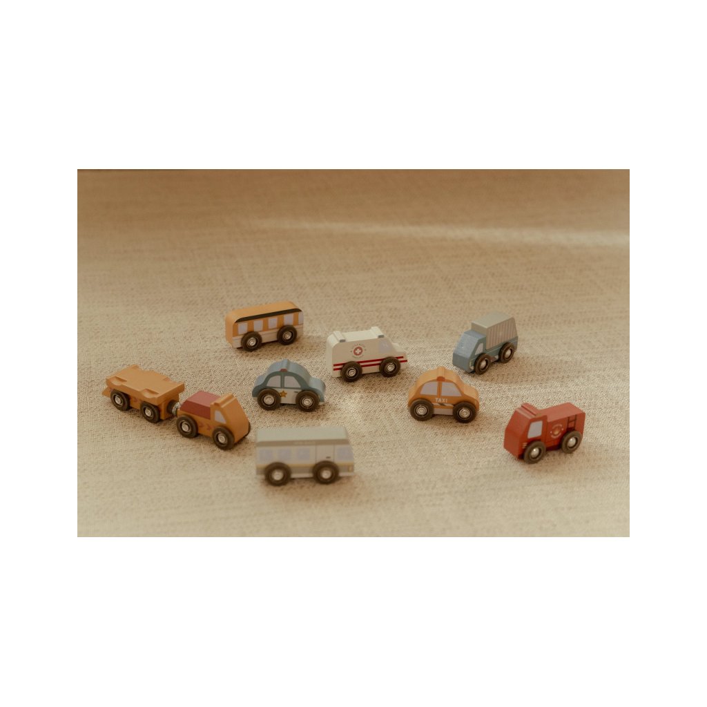 Mesto je stále v pohybe! Táto sada drevených vozidiel rôznych profesií je pripravená vyraziť do akcie a pomáhať tam, kde je treba. Hasičské auto vychádza k požiaru, policajné vozidlo hliadkuje po meste a nákladné auto dováža zásoby - každý deň prináša nové dobrodružstvo.