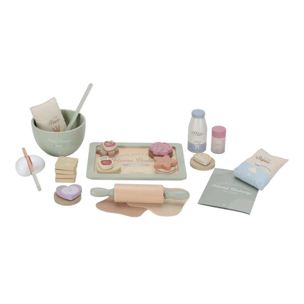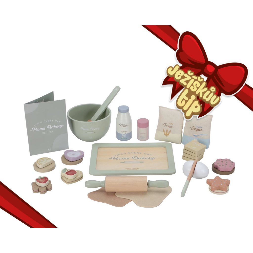 Sada obsahuje všetko potrebné na pečenie: kartičku s receptom, drevené suroviny ako vajcia, maslo, múku, cukor, mlieko, farebné posypky ak tomu misu na miešanie, valček, tácku a doplnky na zdobenie. Nechýbajú ani hotové kúsky cukroviniek a plát cesta z plsti, ktorý si môžu deti rozváľať a nazdobiť podľa vlastnej fantázie.