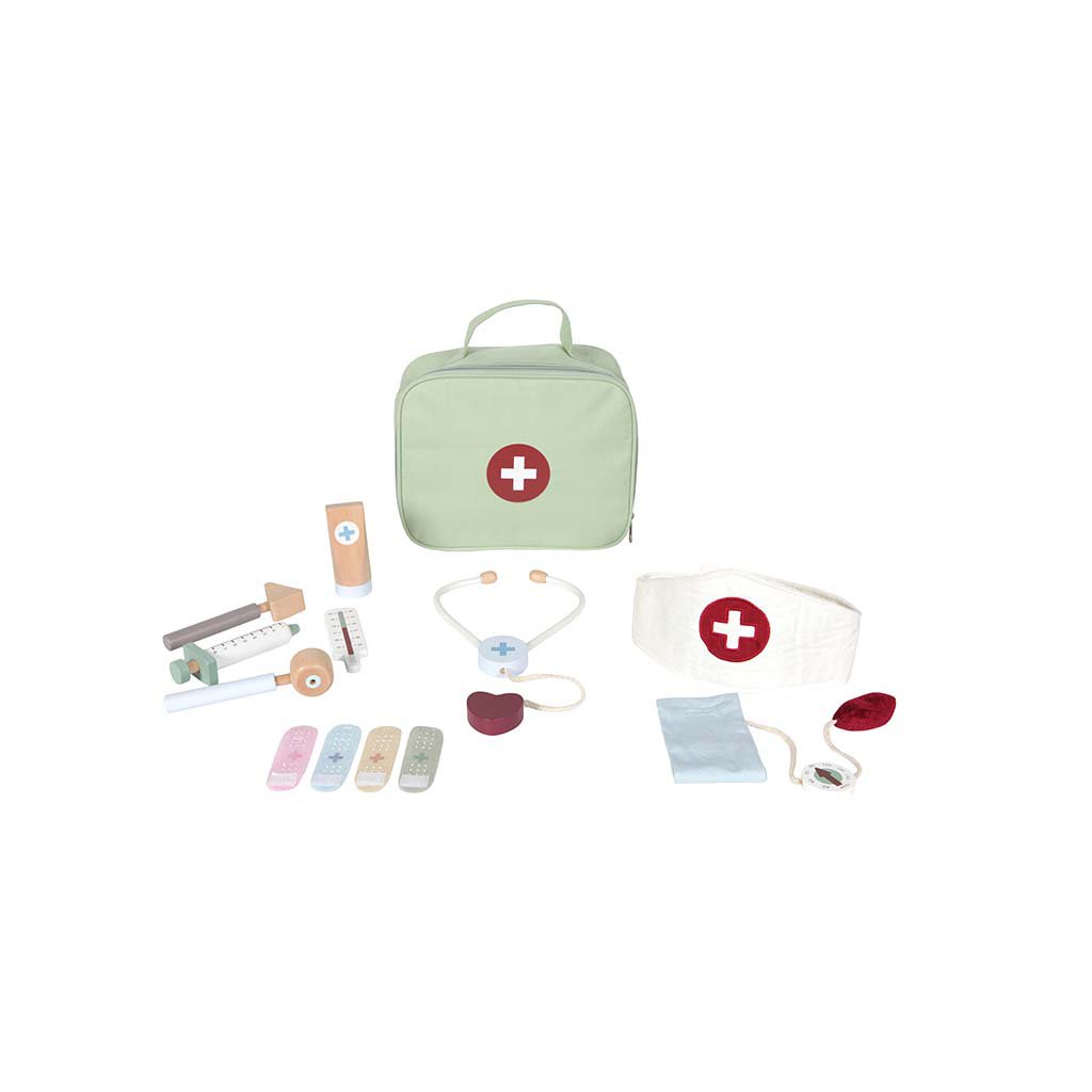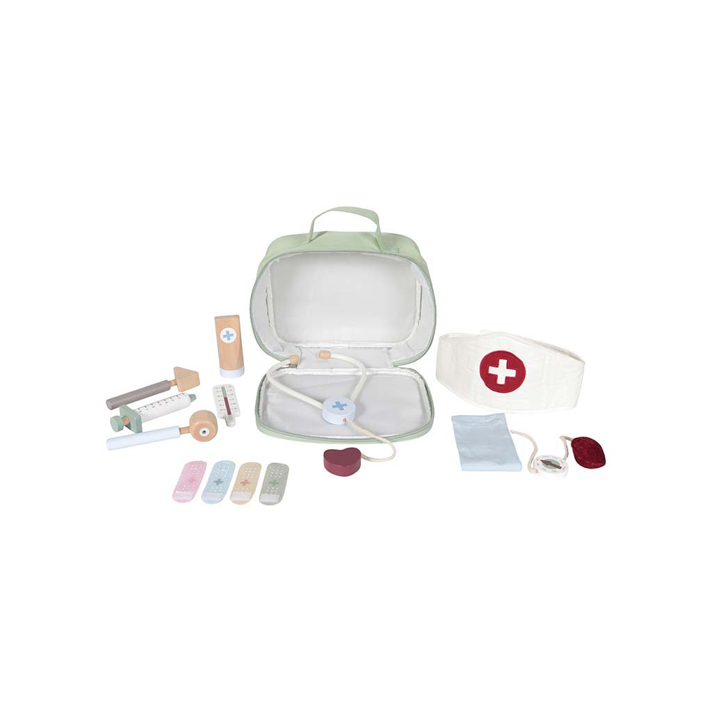 Sada obsahuje: plátenú lekársku tašku, náplaste (4 rôzne farby), teplomer, striekačku, tubu s masťou, stetoskop, reflexné kladivko, tlakomer, otoskop a lekársku čiapku.