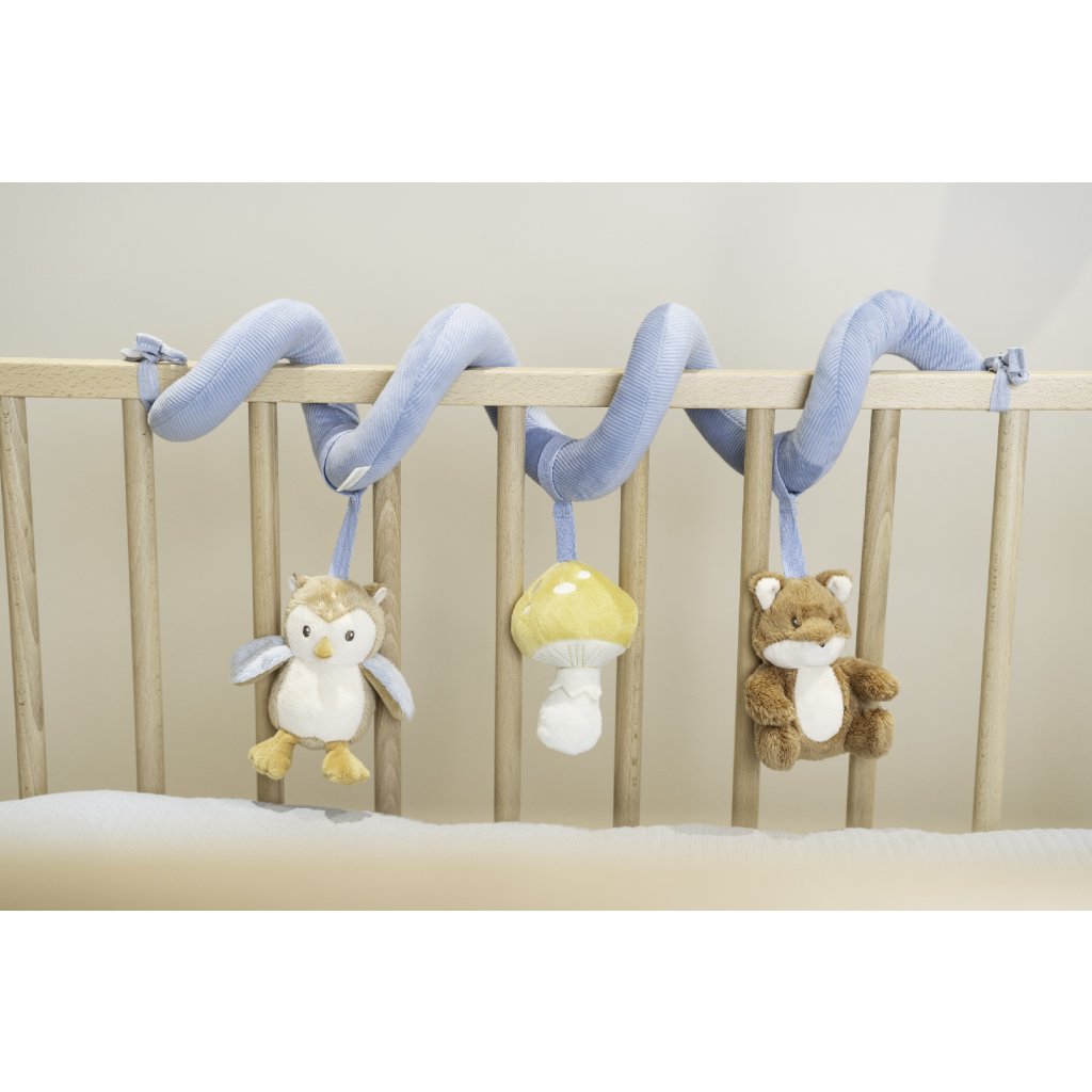 Textilná špirála so zavesenými hračkami v podobe líšky, sovy a hubky zabaví vaše bábätko v postieľke, kočíku aj v autosedačke. Mäkké hračky vyrobené z jemného plyšu hrkajú, šuštia a ponúkajú rôzne textúry na skúmanie. Hračky stimulujú koordináciu ruka/oko dieťaťa.