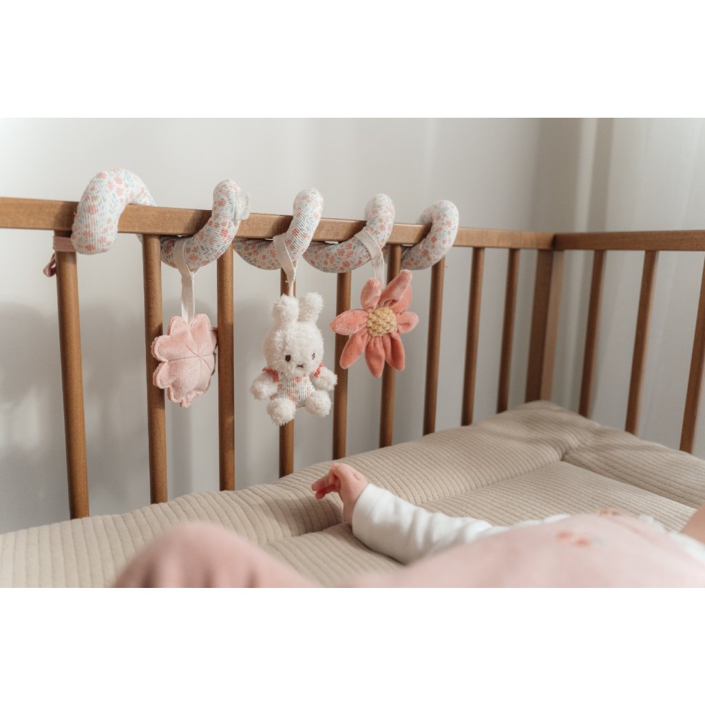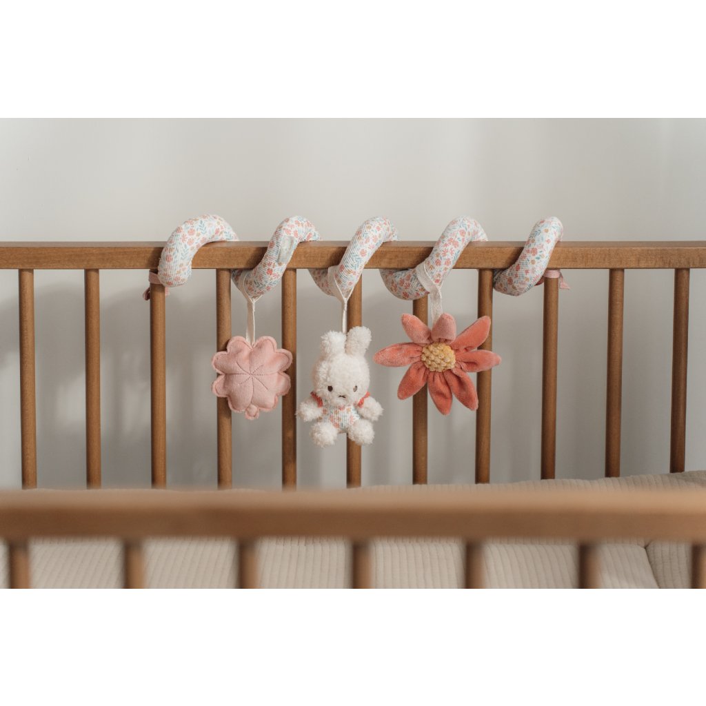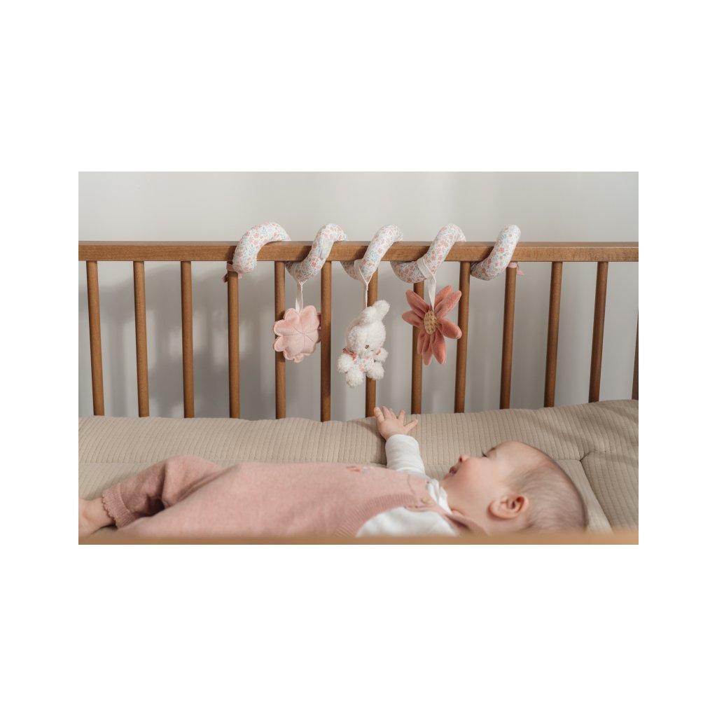 Textilná špirála so zavesenými mäkkými hračkami z jemného plyšu v podobe králička, kvietka a štvorlístka zabaví vaše bábätko v postieľke, kočíku aj v autosedačke. Hračky stimulujú koordináciu ruka/oko dieťaťa.