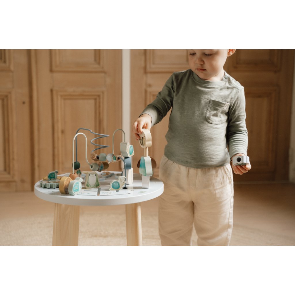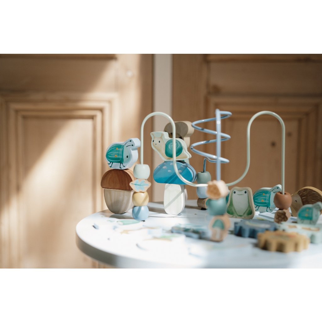 Drevený multifunkčný stolík v krásnom a vysoko kvalitnom prevedení ponúka vášmu dieťaťu množstvo rôznorodých aktivít, ktoré dieťa zabavia a zároveň pomáhajú rozvíjať jeho jemnú motoriku aj jednotlivé zmysly. Lákať dieťa na skúmanie budú pohyblivé, posuvné aj odnímateľné drevené diely v podobe ježka, slimáka, žaby, hubiek a ďalších motívov zo života v lese.