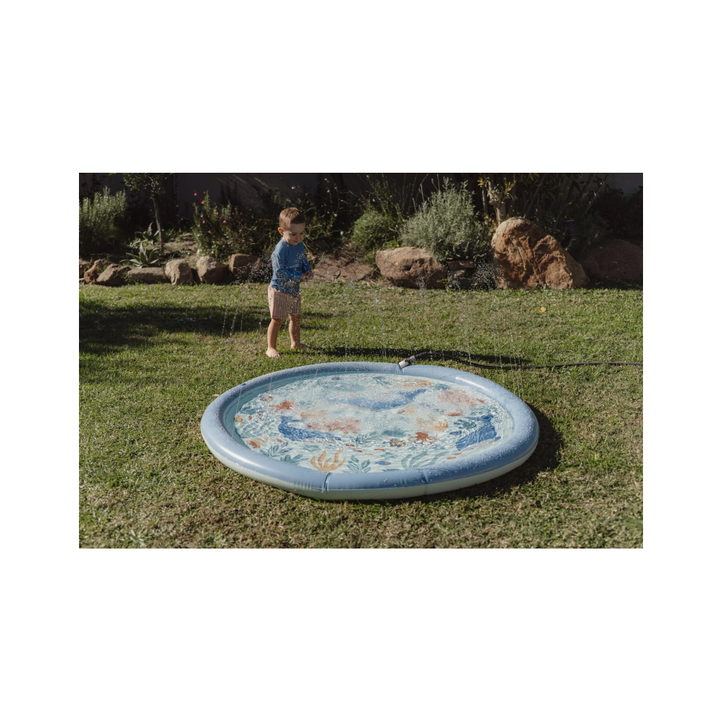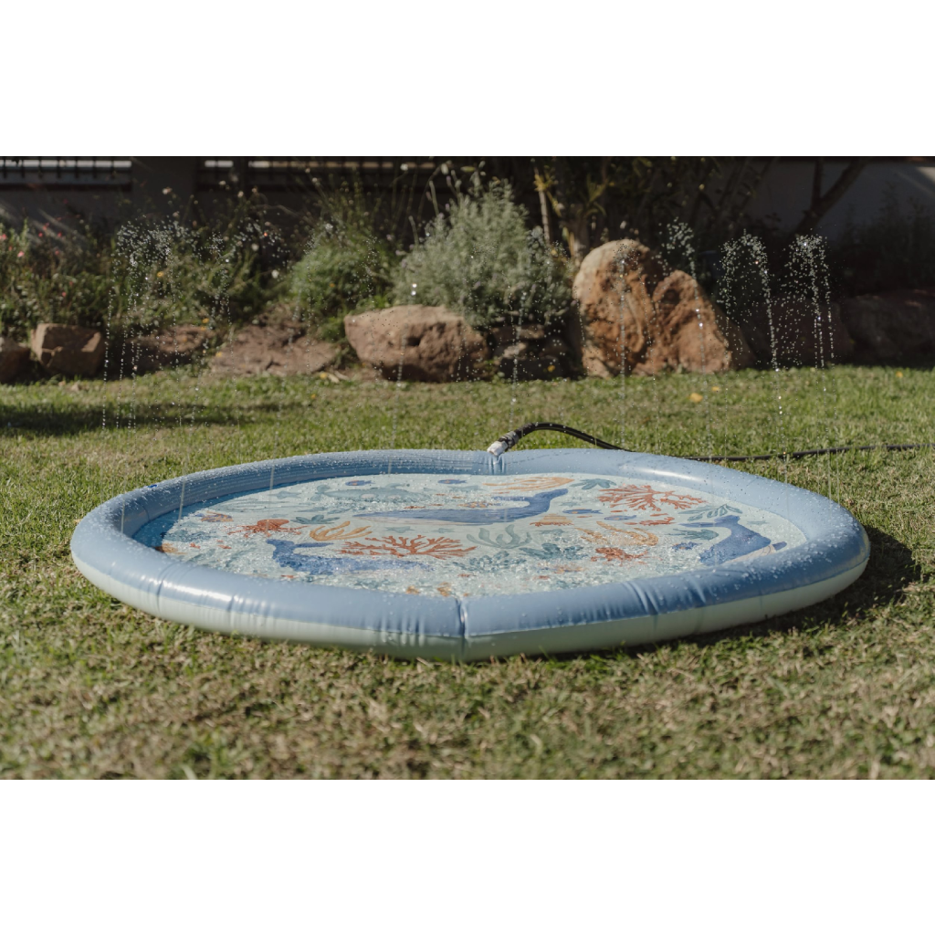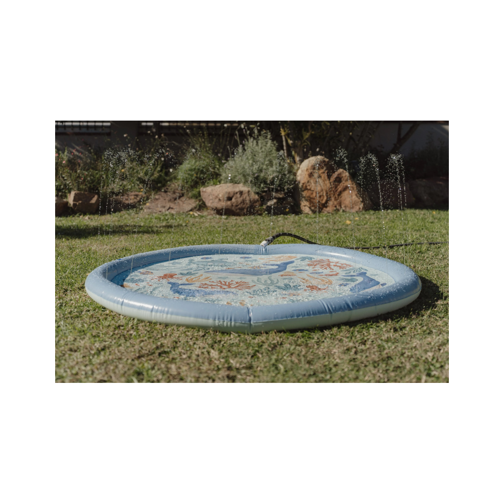 Originálna hracia podložka s vodotryskom, ktorý vytvoríte jednoducho pripojením na záhradnú hadicu s pomocou priloženej spojky. Podložka s krásnou potlačou motívov zo života pod morskou hladinou je ideálny doplnok na záhradu počas horúcich letných dní. Deti si budú užívať behanie cez striekajúci vodotrysk aj hranie sa s vodou na podložke, ktorá funguje ako plytký bazénik.