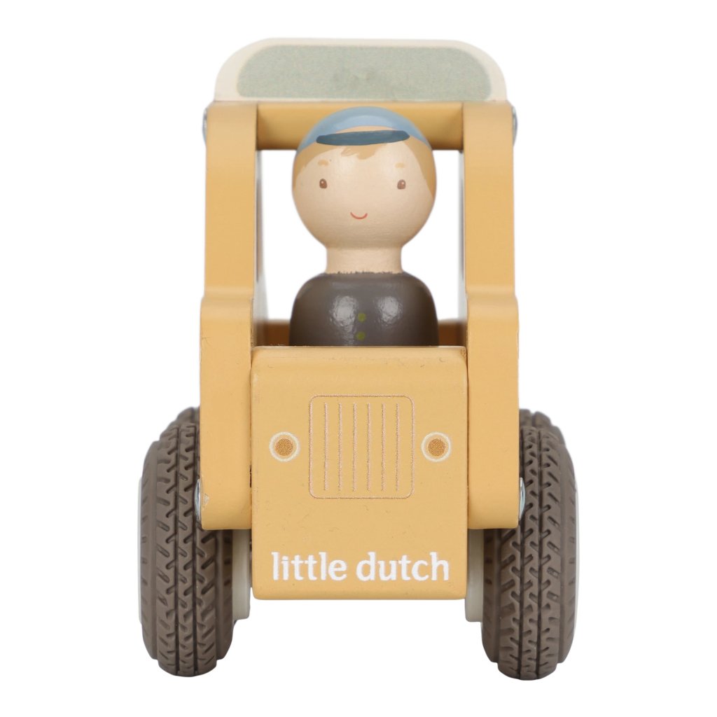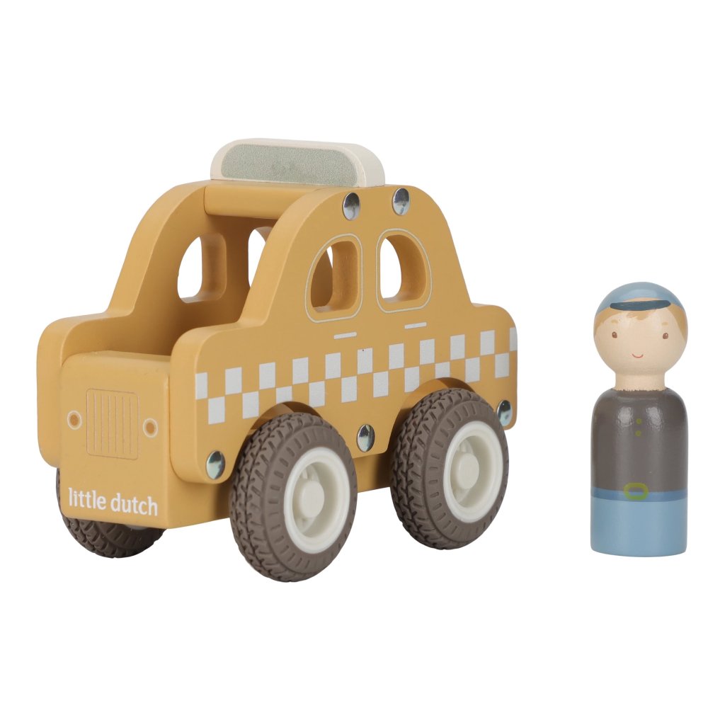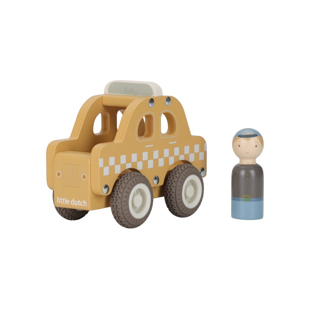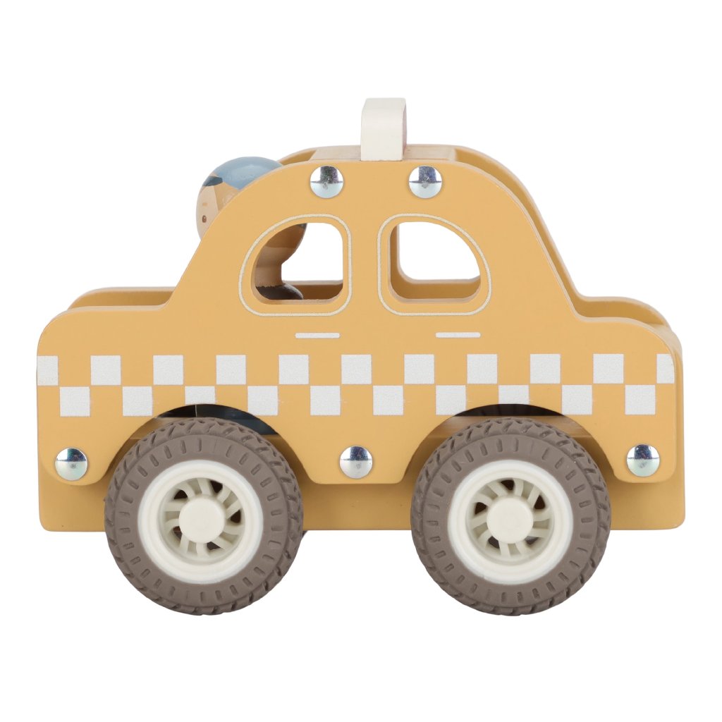 Naskočte a nechajte sa odviezť! Toto drevené taxi je pripravené bezpečne dopraviť každého cestujúceho do cieľa. Vďaka gumovým pneumatikám sa hladko pohybuje po podlahe a sympatický vodič už čaká, až vyrazíte na cestu.