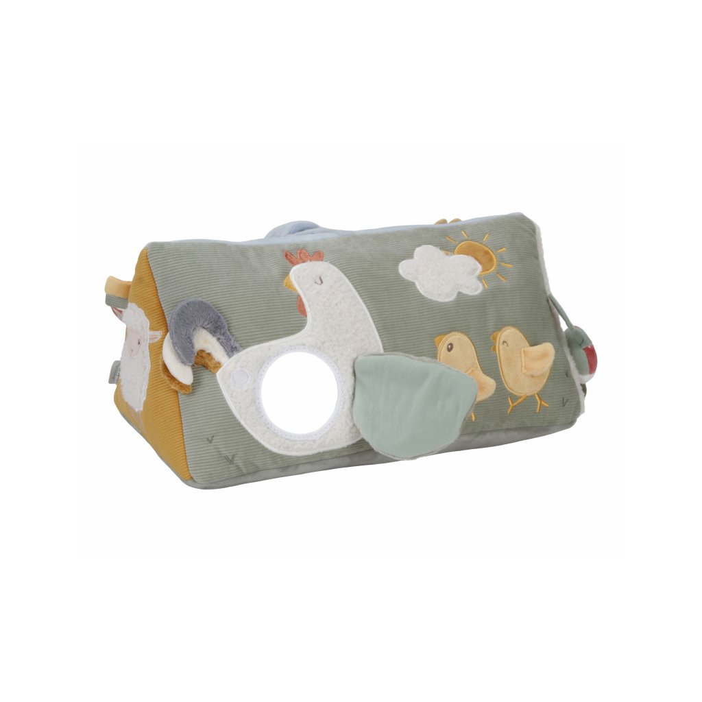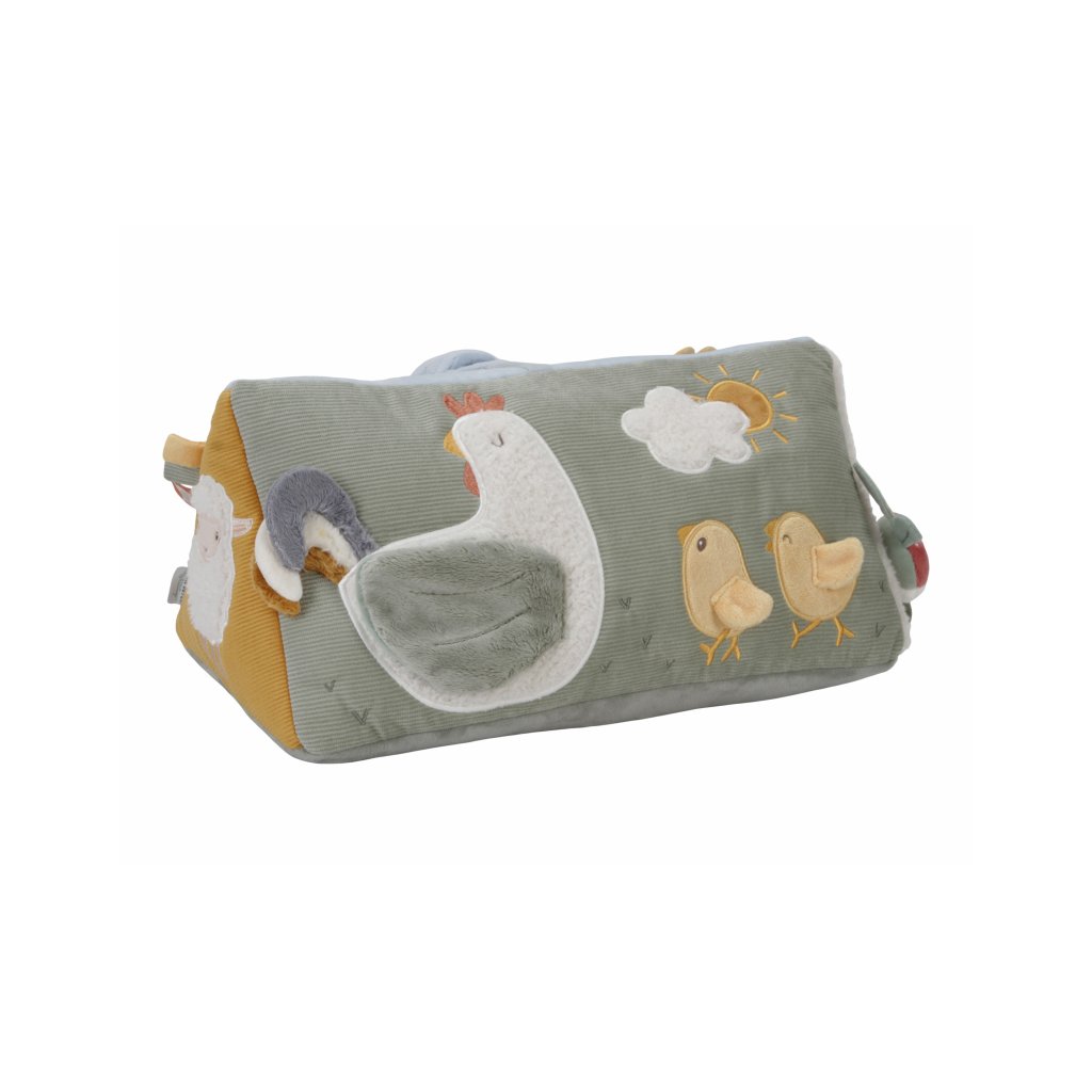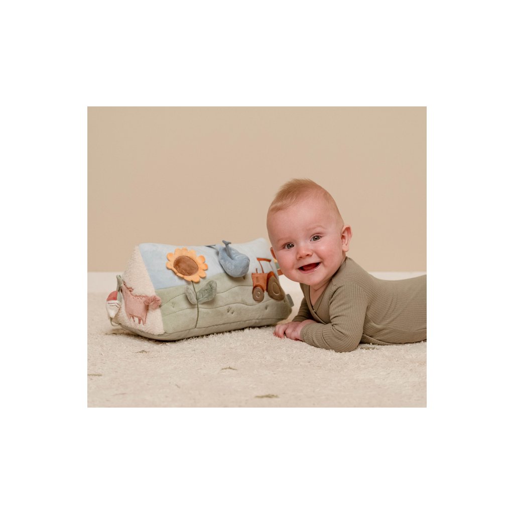 Vankúšik z jemného, mäkkého materiálu s krásnymi motívmi života na farme je špeciálne navrhnutý, aby podporoval hranie dieťatka na brušku. Hračky na vankúšiku aj originálne vyšívané aplikácie lákajú dieťatko na skúmanie a pozorovanie. Každá strana vankúšika je iná, takže stačí vankúšik otočiť a ponúknuť dieťatku nové podnety na zabavenie aj rozvíjanie jeho jednotlivých zmyslov.