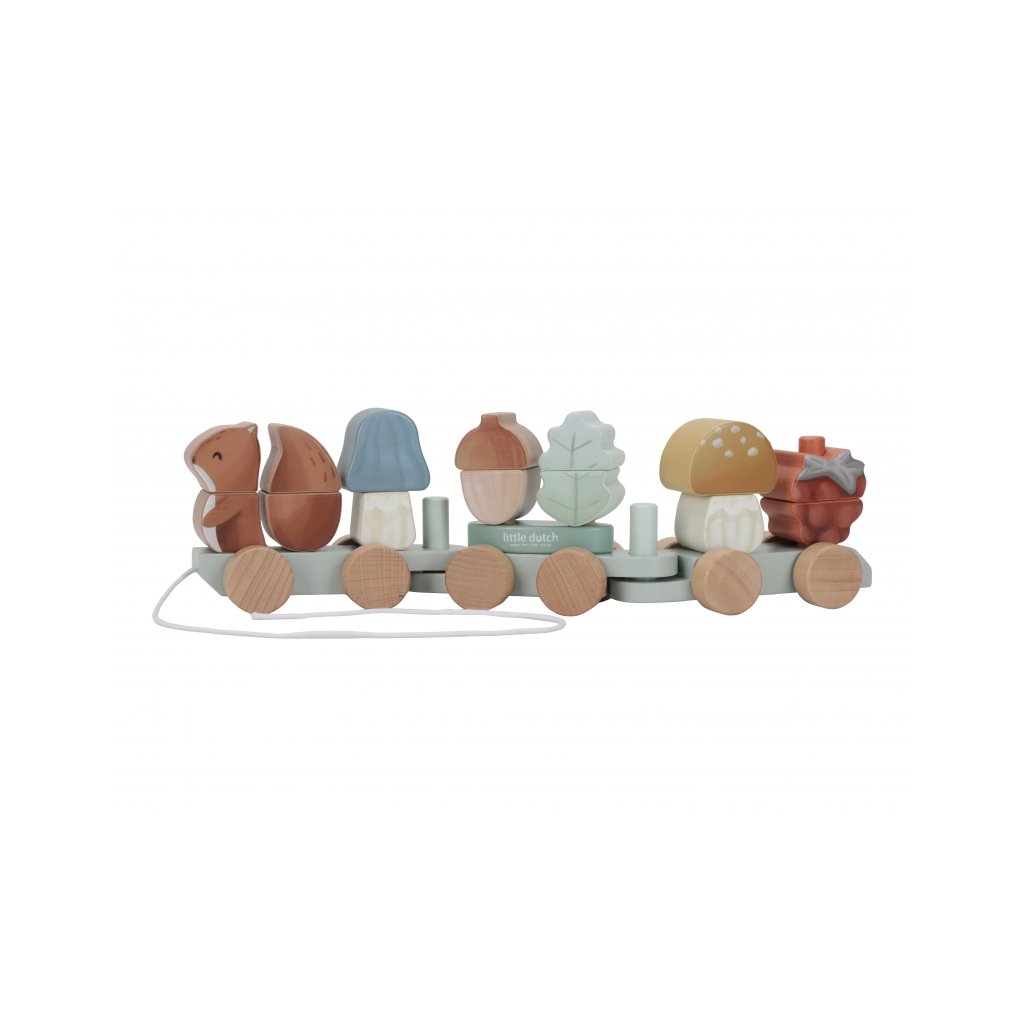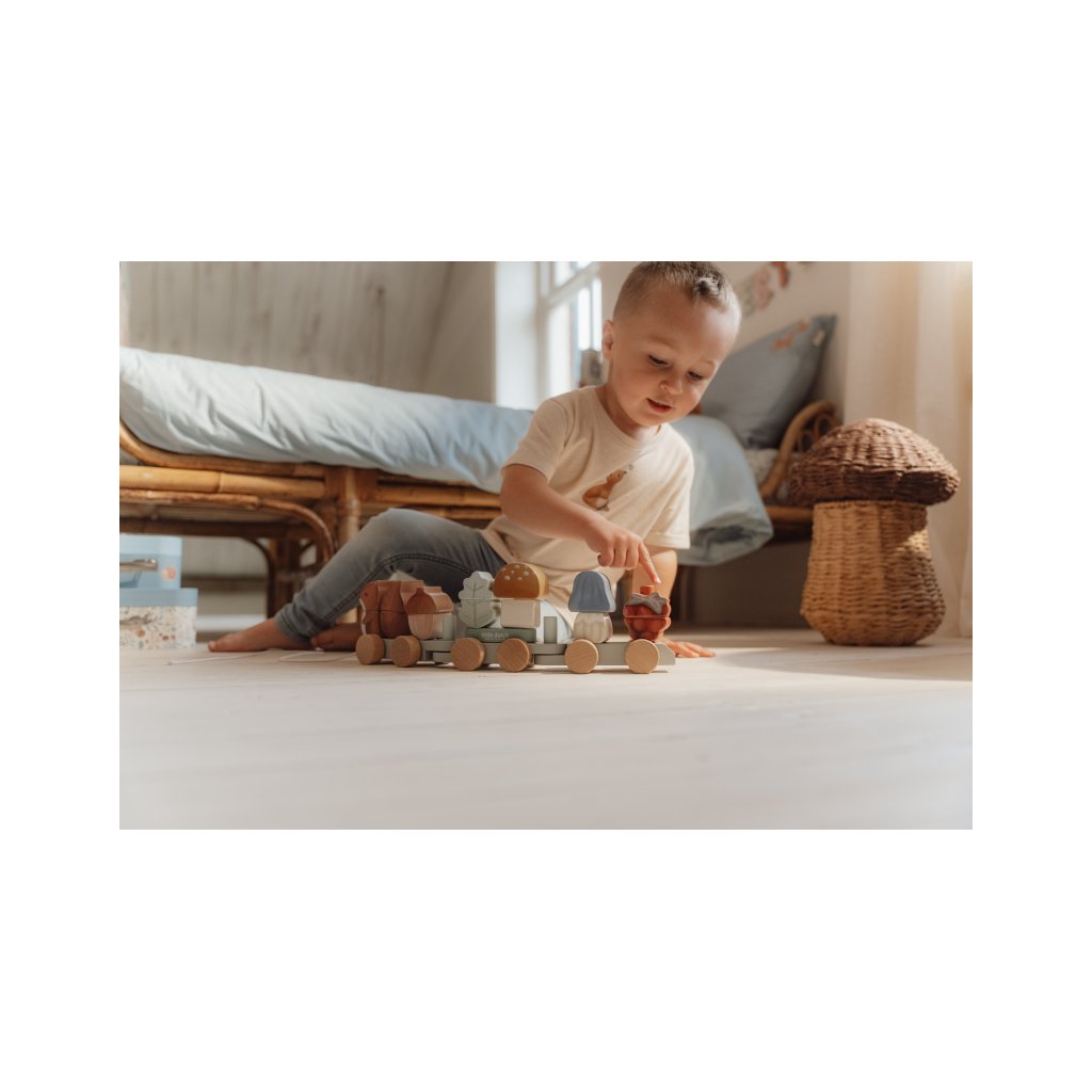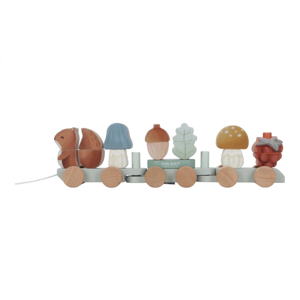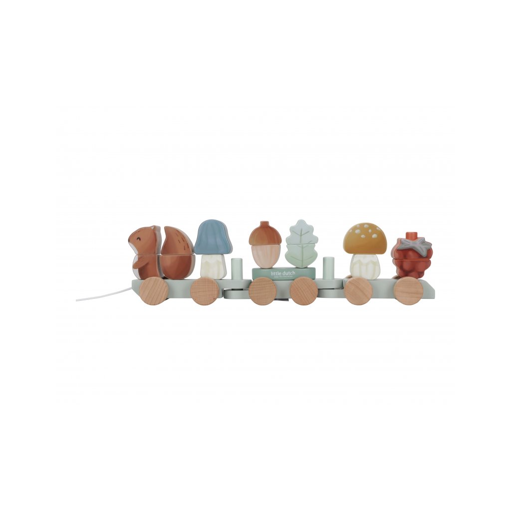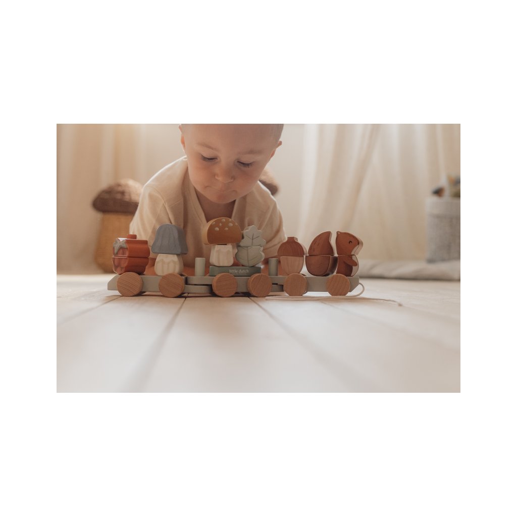 Originálny drevený vláčik z dielne Little Dutch je tvorený kockami rôznych farieb v tvare veveričky, húb, maliny a listu. Kombinovaním kociek si vaše dieťa môže zostavovať rôzne varianty vagónov podľa svojej fantázie.