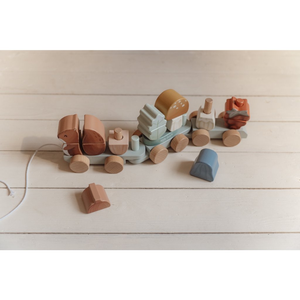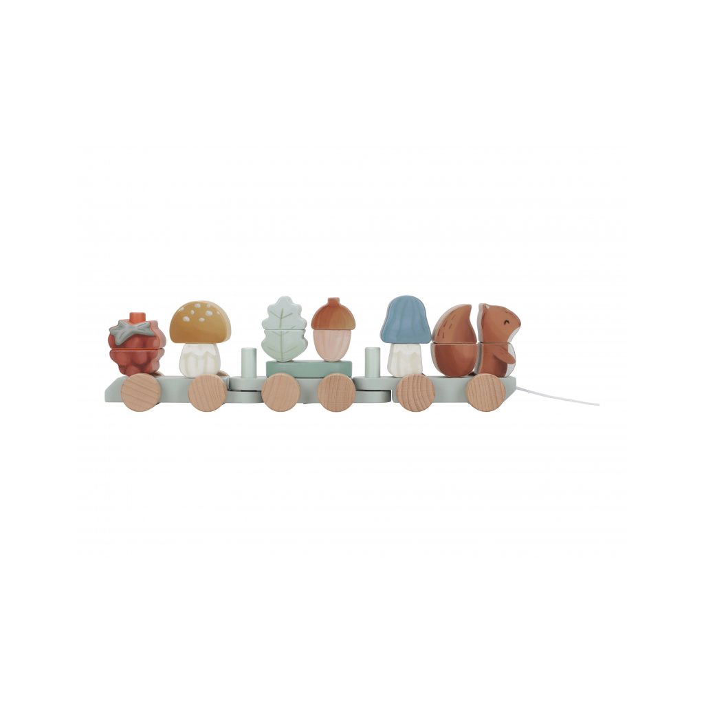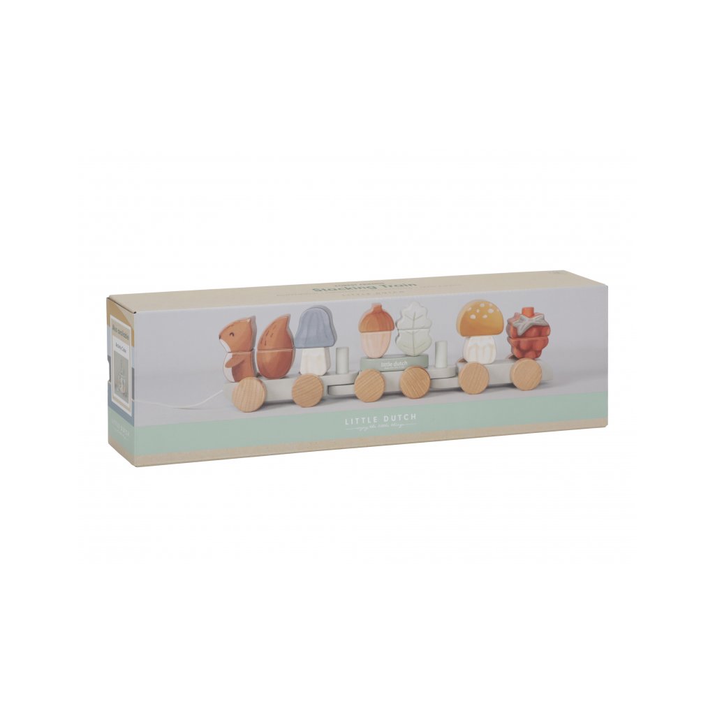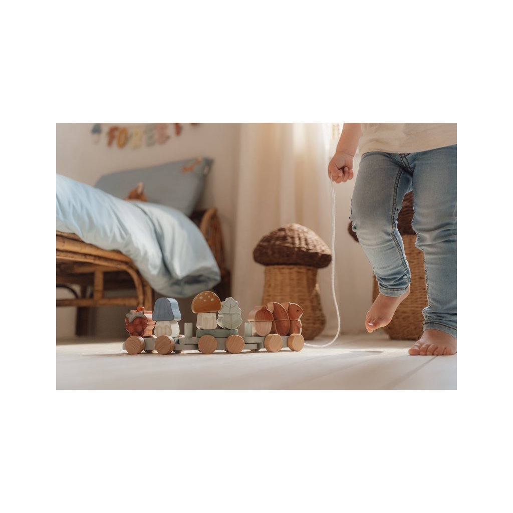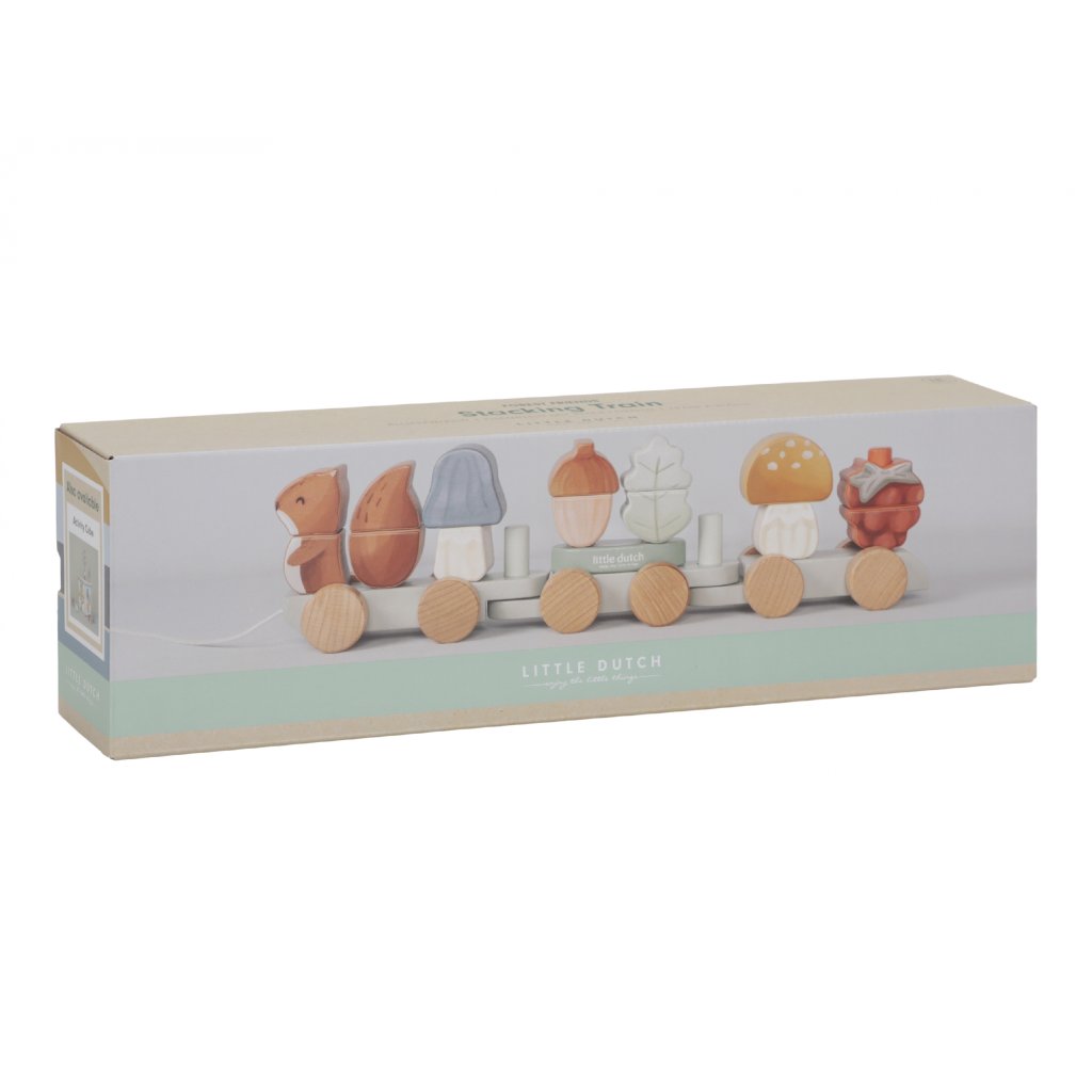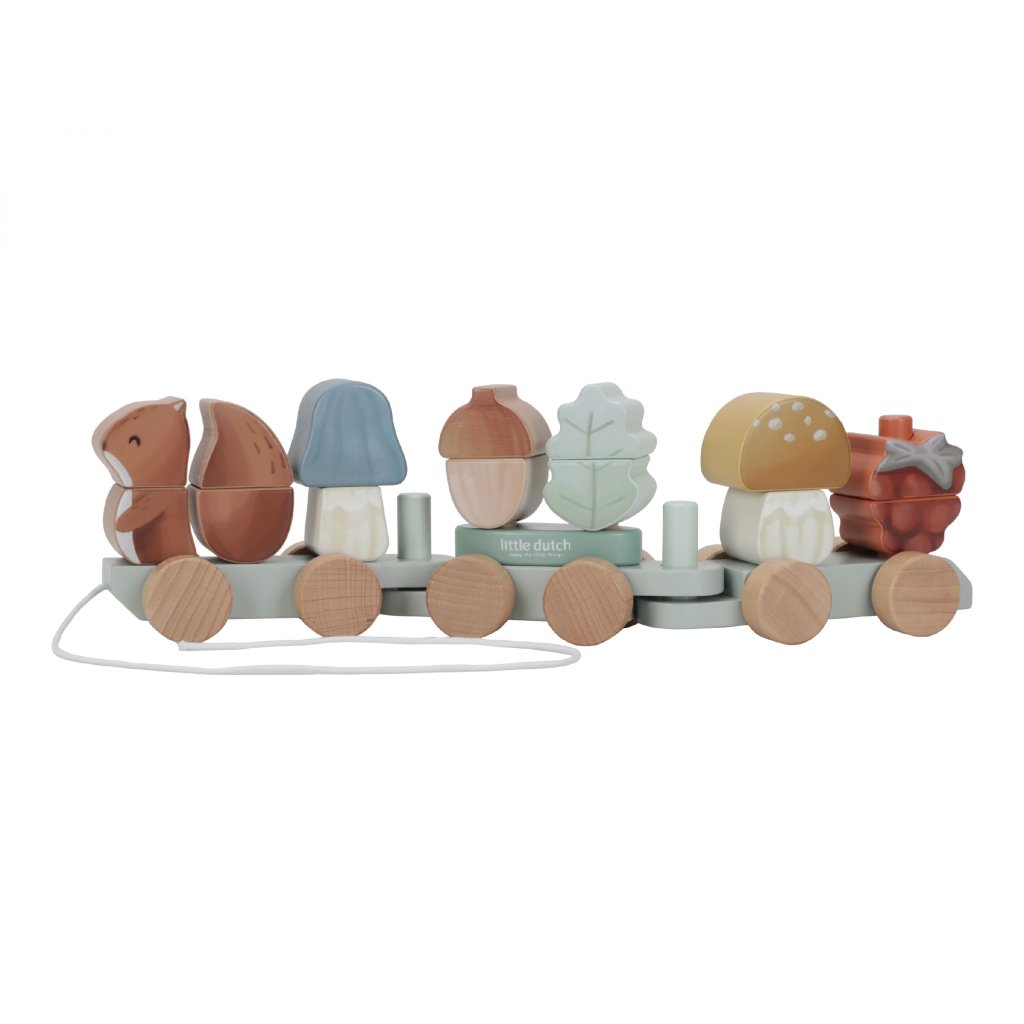 Originálny drevený vláčik z dielne Little Dutch je tvorený kockami rôznych farieb v tvare veveričky, húb, maliny a listu. Kombinovaním kociek si vaše dieťa môže zostavovať rôzne varianty vagónov podľa svojej fantázie.