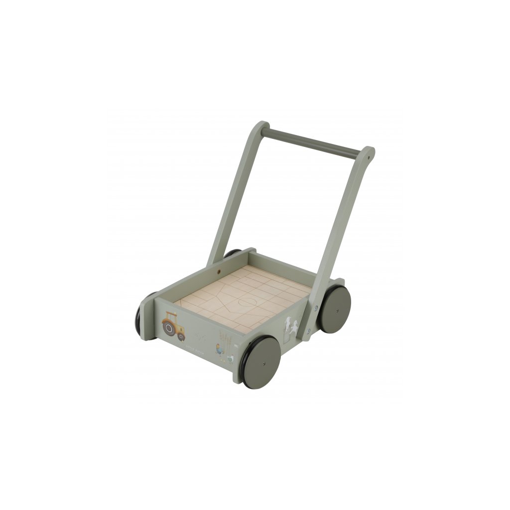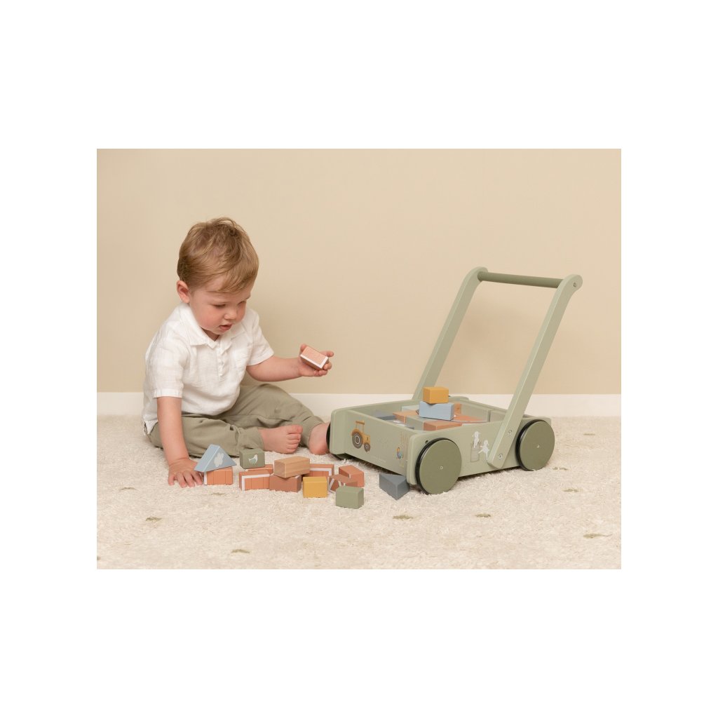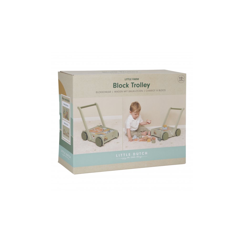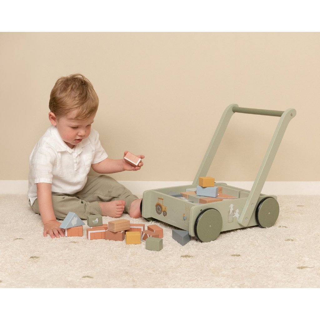 Drevený vozíček je vybavený kolesami s gumovým pruhom a je naplnený farebnými drevenými kockami rôznych tvarov. Rukoväť je v ideálnej výške pre batoľatá, aby mohli vozíček pekne tlačiť pred sebou.