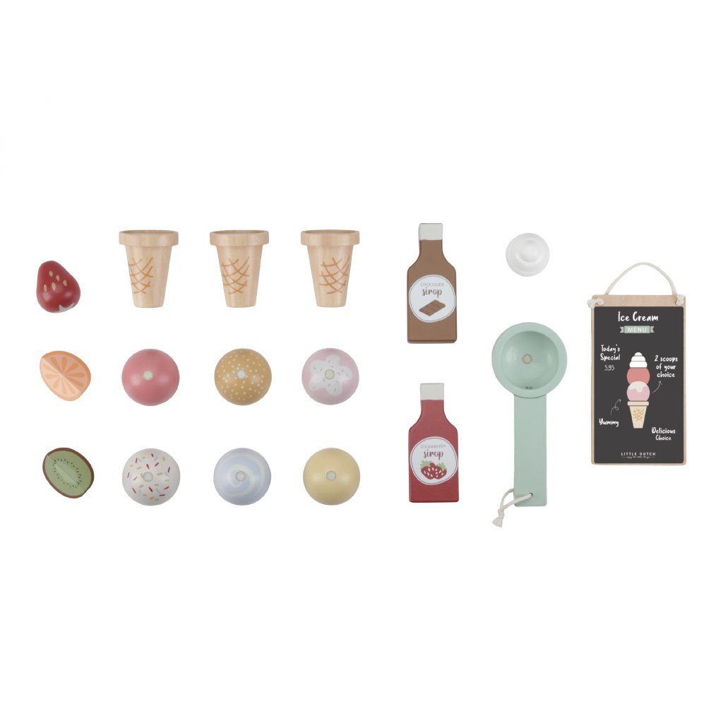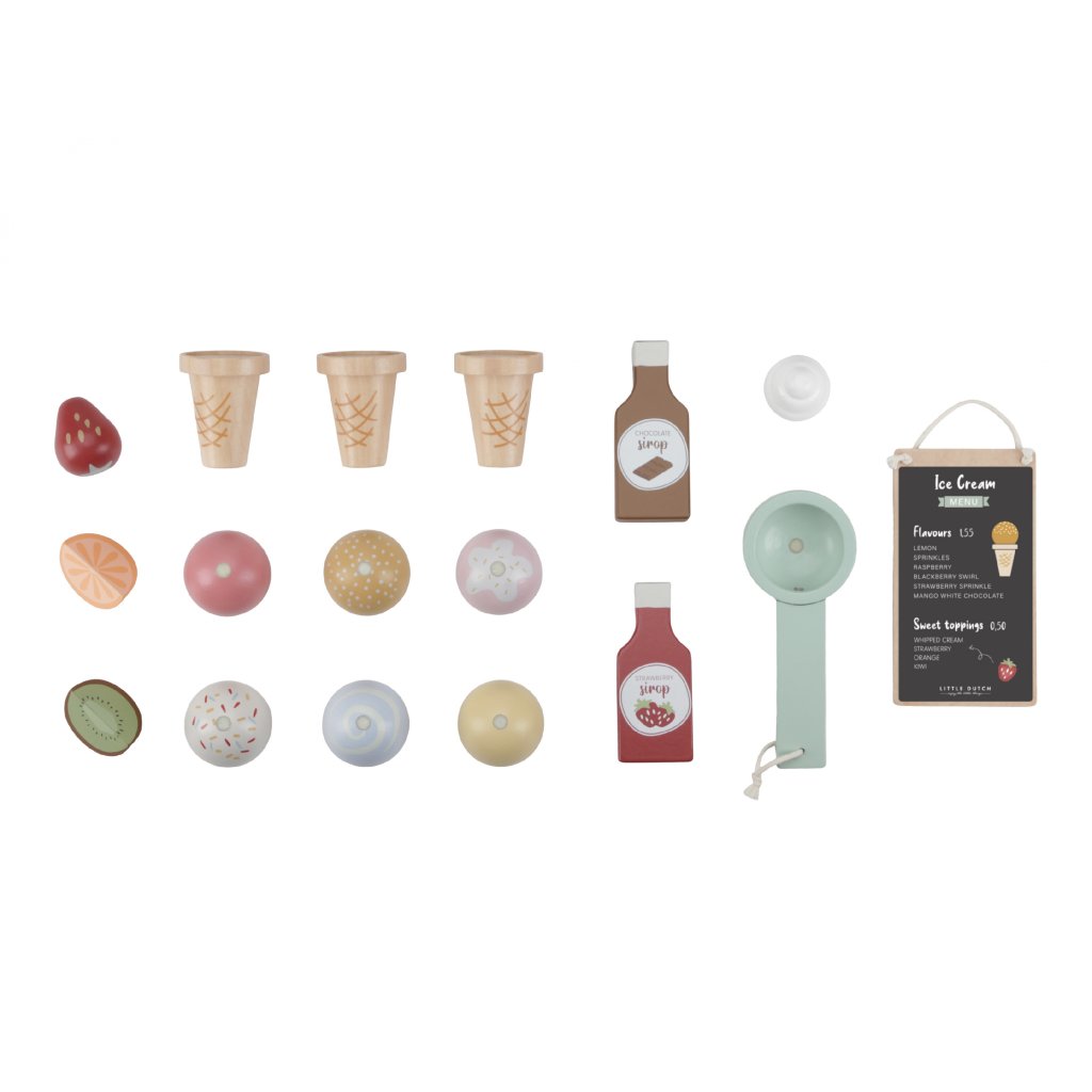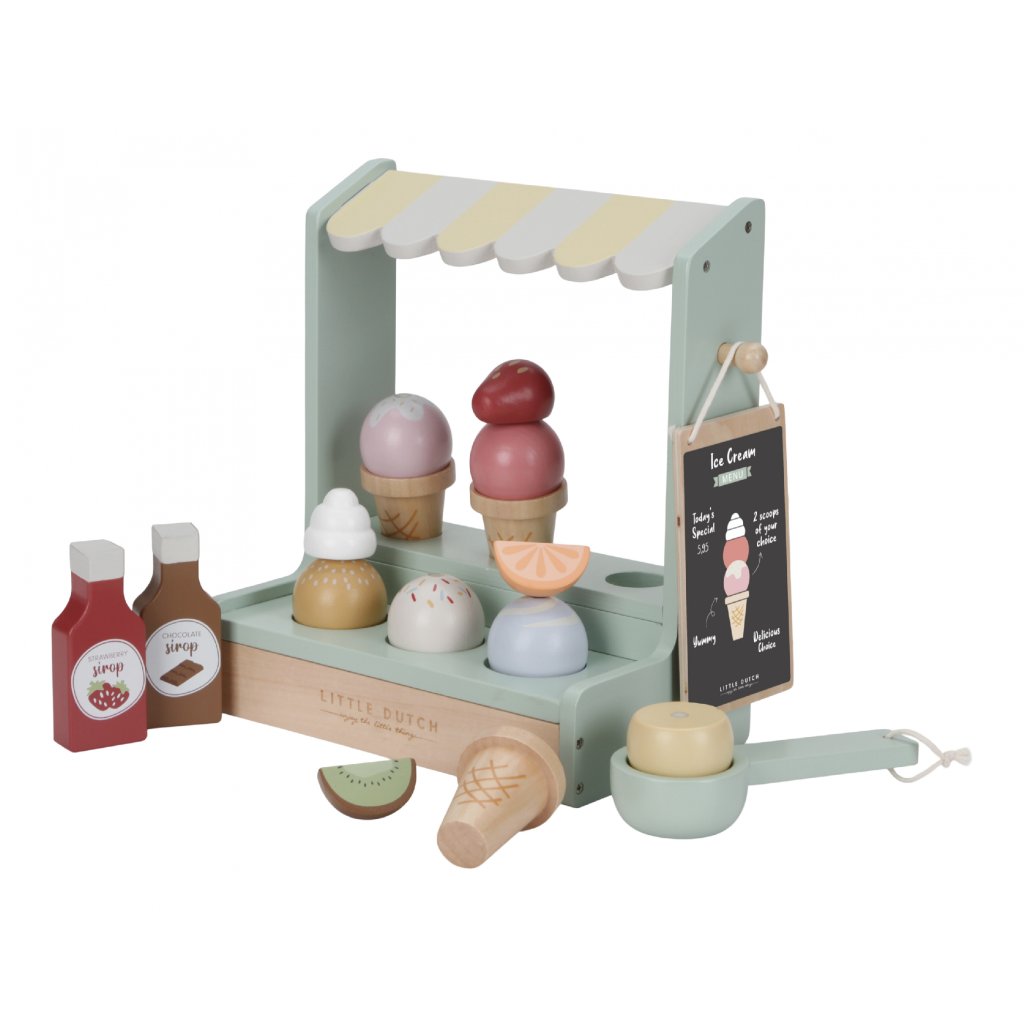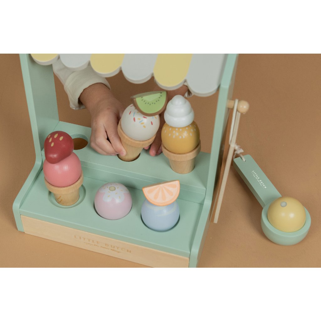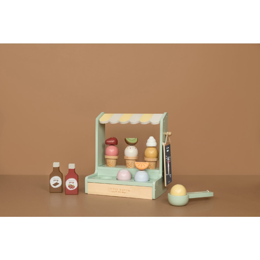 Aká je vaša obľúbená príchuť zmrzliny? Vanilková alebo jahodová? Tento zmrzlinový stánok s rozkošnou žltobielou markízou vás pozýva na ochutnanie hneď šiestich príchutí. K dispozícii sú tri kornúty, ktoré môžete naplniť kopčekmi zmrzliny a dozdobiť ovocím, šľahačkou a jednou z dvoch poliev.