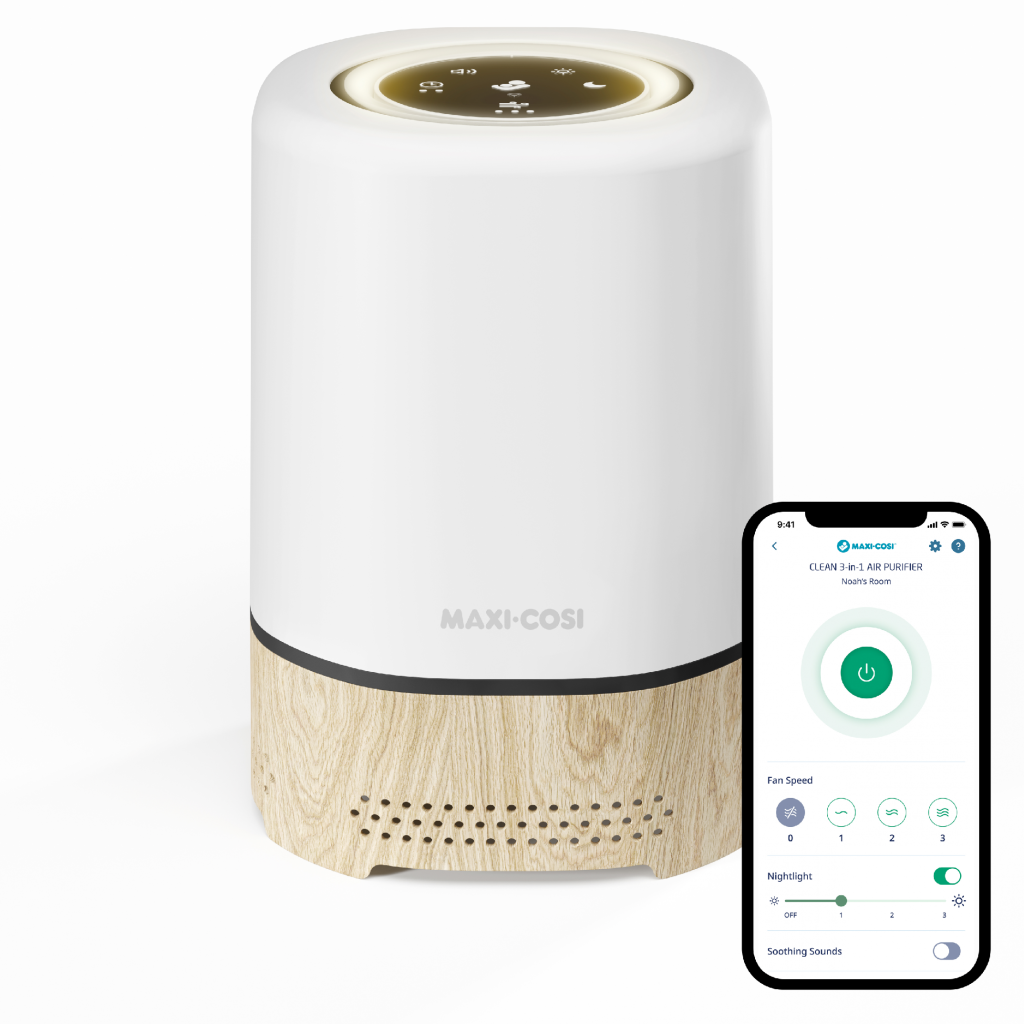 Čistička vzduchu Maxi-Cosi 3v1 Clean je inteligentné zariadenie do detskej izby, ktoré pomáha vytvoriť čisté a pokojné prostredie pre spánok aj každodennú pohodu. V jednom prístroji kombinuje čističku vzduchu, nočné svetlo a reproduktor s upokojujúcimi zvukmi. Vďaka výkonnej HEPA 13 filtrácii odstraňuje zo vzduchu až 99,97% prachu, peľu, alergénov a ďalších častíc, takže sa vášmu dieťaťu dýcha lepšie vo dne aj v noci. Nastaviteľné svetlo a 4 upokojujúce zvuky vám umožnia vytvoriť príjemnú atmosféru pred zaspávaním. Všetko pohodlne nastavíte aj na diaľku cez aplikáciu Maxi-Cosi Connected Home.