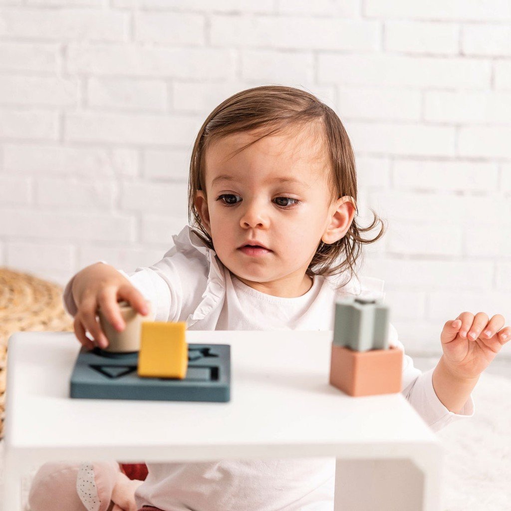 Vkladačka vyrobená z mäkkého, vysoko kvalitného silikónového materiálu, ktorý je príjemný na dotyk a spĺňa všetky normy pre hračky. Dá sa využiť nielen ako vkladacia hračka, ale aj ako hryzačky rôznych tvarov pre bábätká pri prerezávaní zúbkov - poskytuje maximálnu úľavu a zároveň bezpečné a zábavné hranie. Pomáha bábätkám učiť sa farby, rôzne tvary, trénovať reakcie, logické a motorické zručnosti.