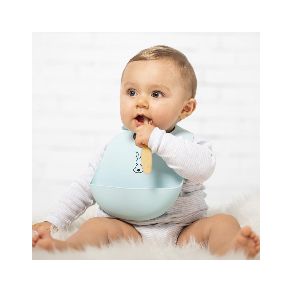 Podbradník Nattou vyrobený z pružného silikónu s motívom roztomilých králikov a praktickou zbernou časťou zabezpečí kŕmenie a jedenie vášho dieťatka bez zbytočného stresu z neporiadku .