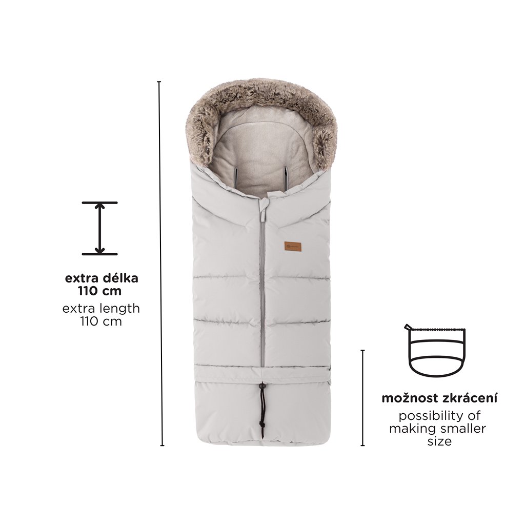 - 4v1 - odopnutím spodnej časti zmeníte veľkosť fusaku na menší, ktorý sa hodí aj do vaničky alebo autosedačky, a pripevnením kožušinky - získate ochranu proti vetru.