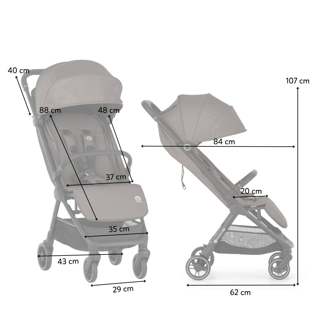 - Rozmery rozloženého kočíka: 84 cm (dĺžka od predného kolieska k rukoväti) × 35 cm (šírka) × 107 cm (výška)