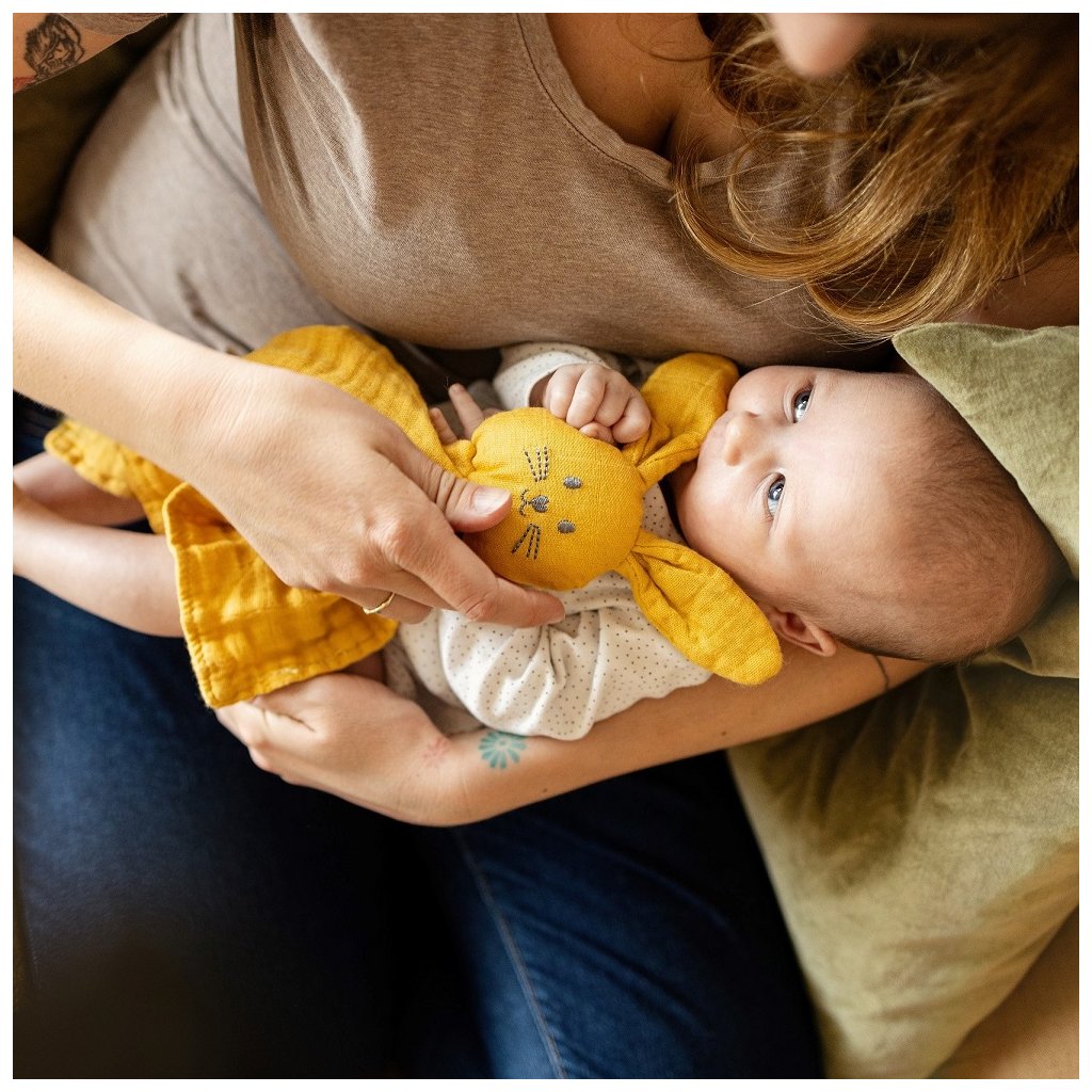Je to hračka bezpečná pre bábätká už od narodenia. Vďaka praktickému tvaru ho ľahko uchopia aj malé detské ručičiky. V jeho hlavičke je navyše ukrytá malá hrkálka, ktorá vydáva príjemný zvuk.