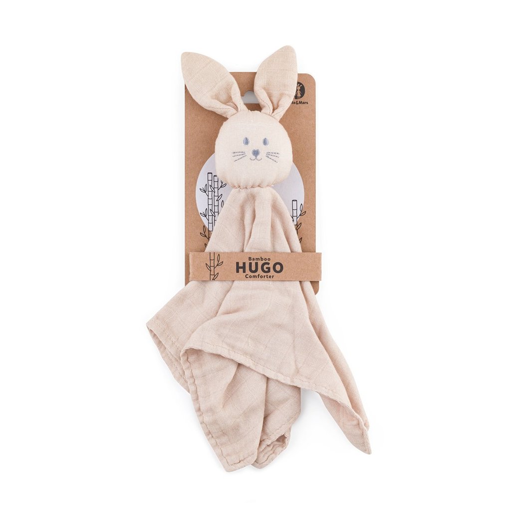 Mäkkučký mušelínový zajko Hugo má jednu tajnú záľubu. Najradšej zo všetkého sa vyvaľuje v posteli a spí. Je to skvelý kamarát a hračka na spanie pre najmenšie detičky. Hugo sa rád túli, prináša pocit tepla a nehy. S ním nikto nie je sám. Je veľmi príjemný a hebký na dotyk, dokáže dieťatko upokojiť po náročnom dni.