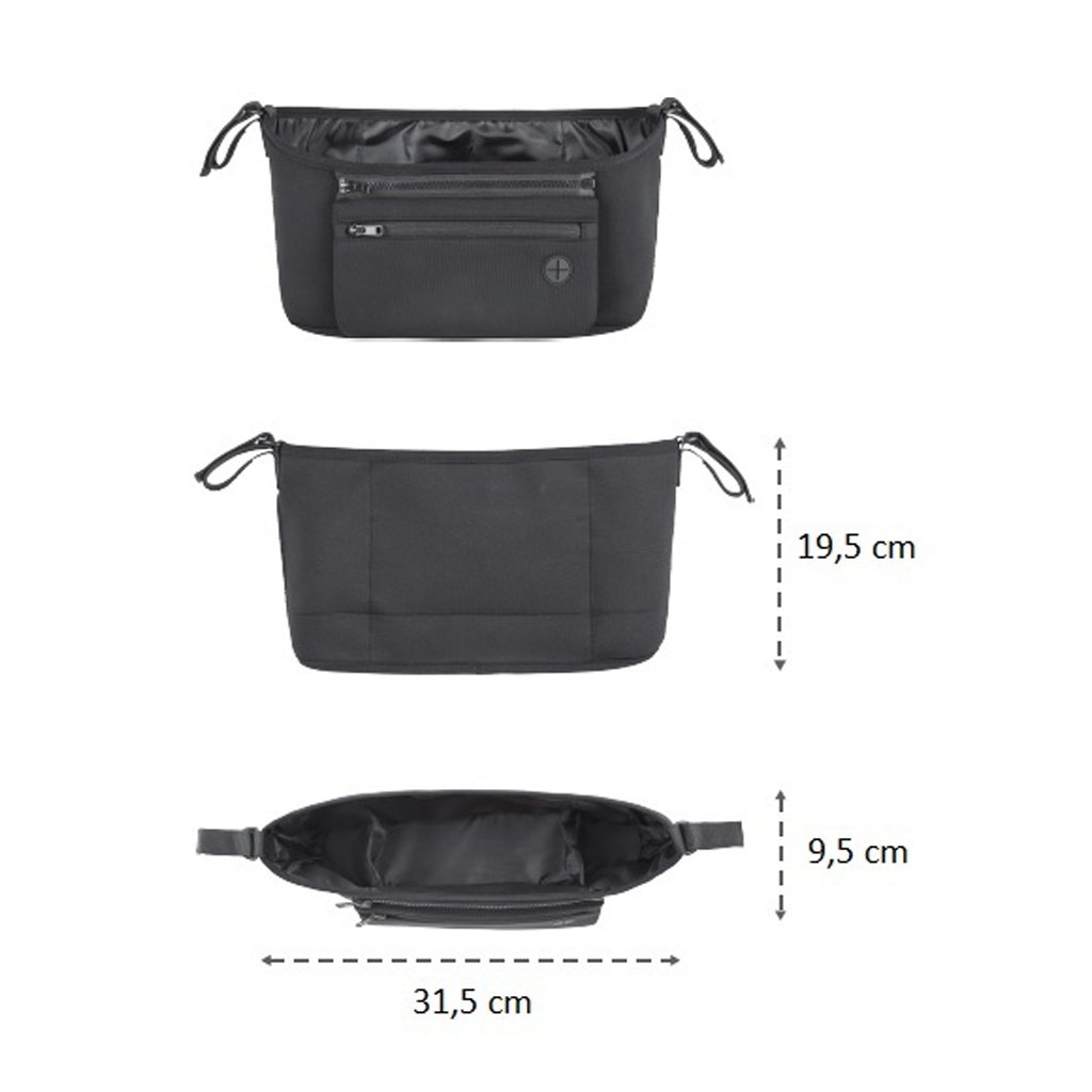 Dve bočné priehradky uskladnia fľašku, či termosku alebo pohár s kávou. Do veľkej prostrednej priehradky ľahko zmestíte všetko čo potrebujete počas prechádzky či výletu. Predné odnímateľné vrecko môžete používať aj samostatne. Je vhodné na uskladnenie mobilu a obsahuje aj port pre slúchadlá, takže počas kočíkovania môžete počúvať svoju obľúbenú hudbu, prípadne telefonovať. Pokiaľ si urobíte zastávku na detskom ihrisku, jednoducho odzipsujete vrecko s mobilom a inými cennosťami a vezmete si ho so sebou.