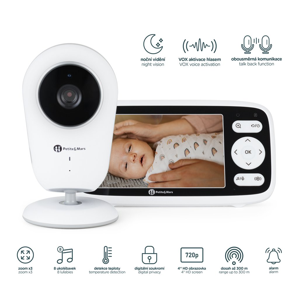 Rodičovská jednotka s 4" displejom a HD rozlíšením 720p zaručuje jasný obraz vášho dieťatka – aj pri slabom osvetlení vďaka nočnému videniu. Pomocou digitálneho priblíženia 3× si priblížite každý detail – pokojný dych, pohyb či úsmev – bez narušenia spánku.