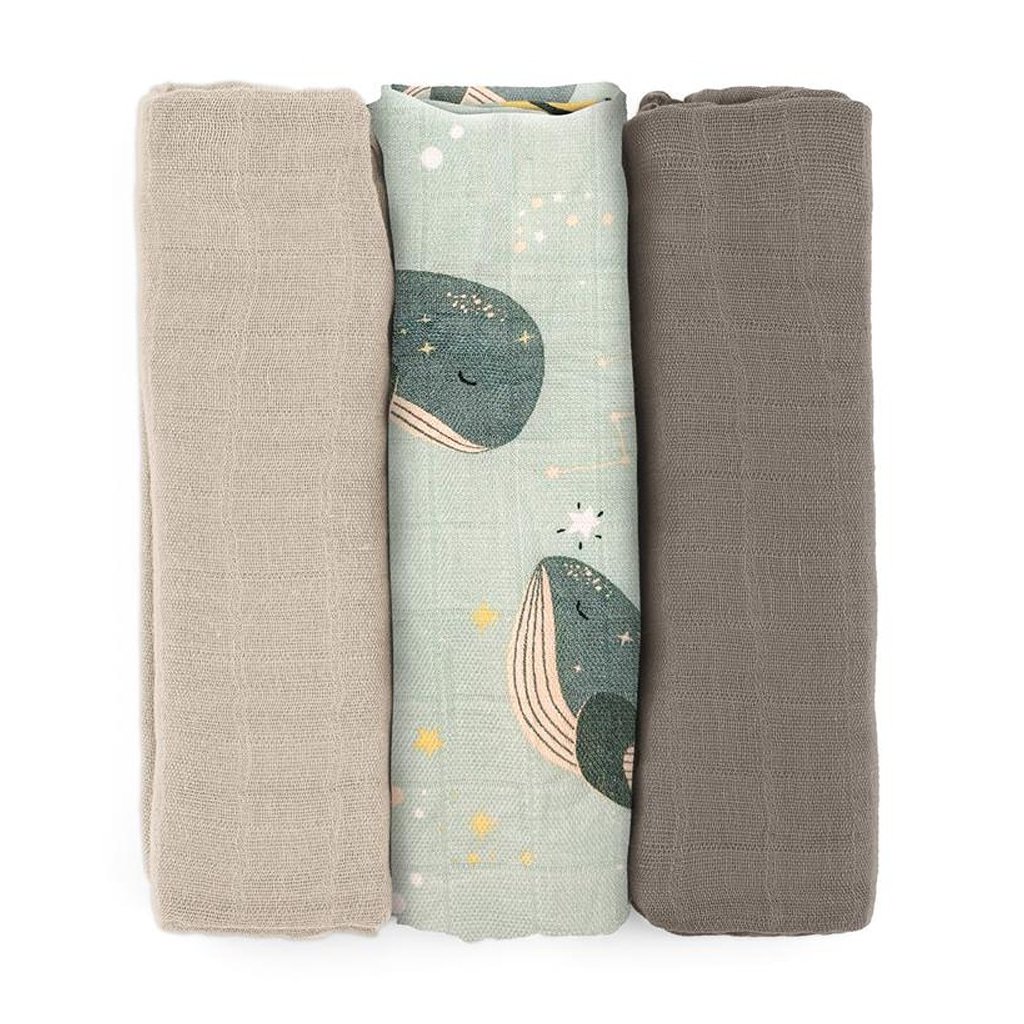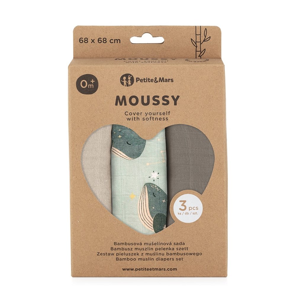 PETITE&MARS Sada plienok bambusová mušelínová 3ks Moussy Whale Song 68 x 68 cm
