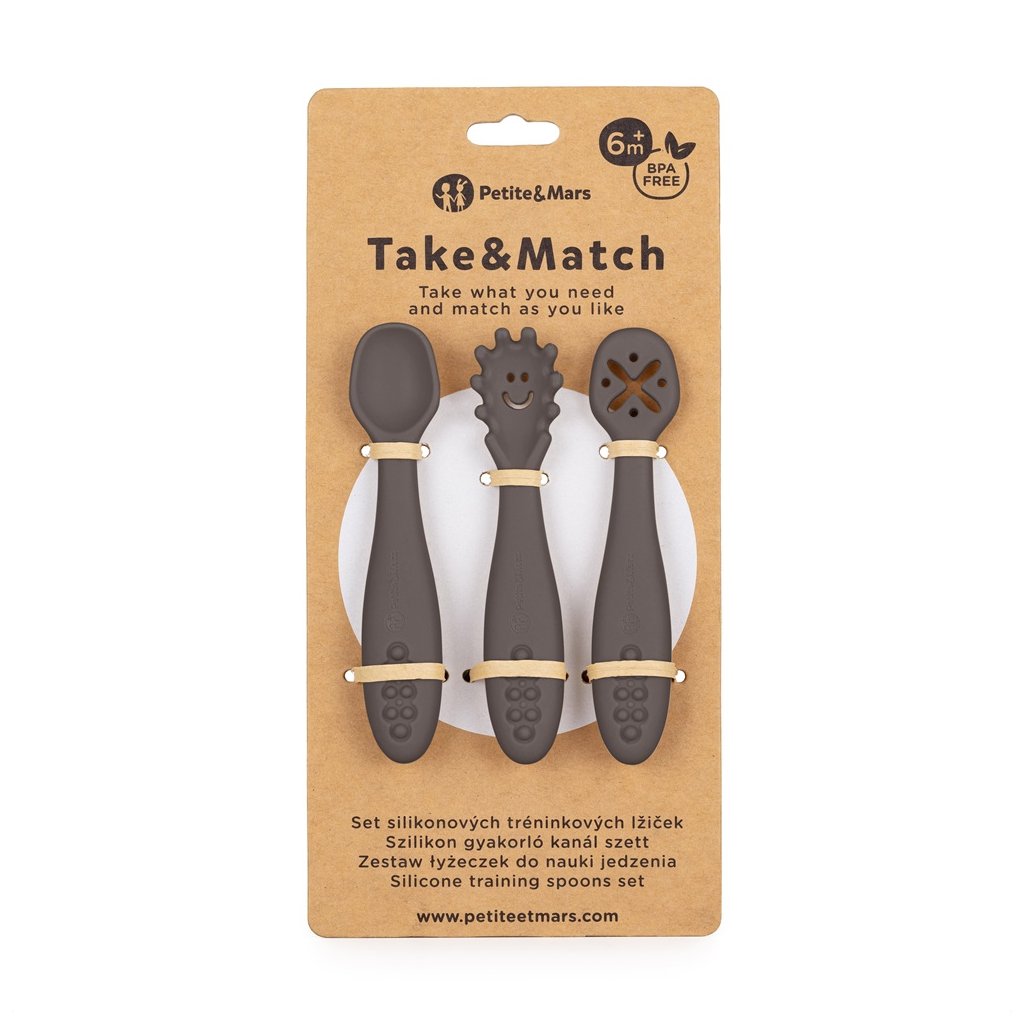 PETITE&MARS Set 3 ks silikónových tréningových lyžičiek Take&Match Bitter Cocoa 6m+
