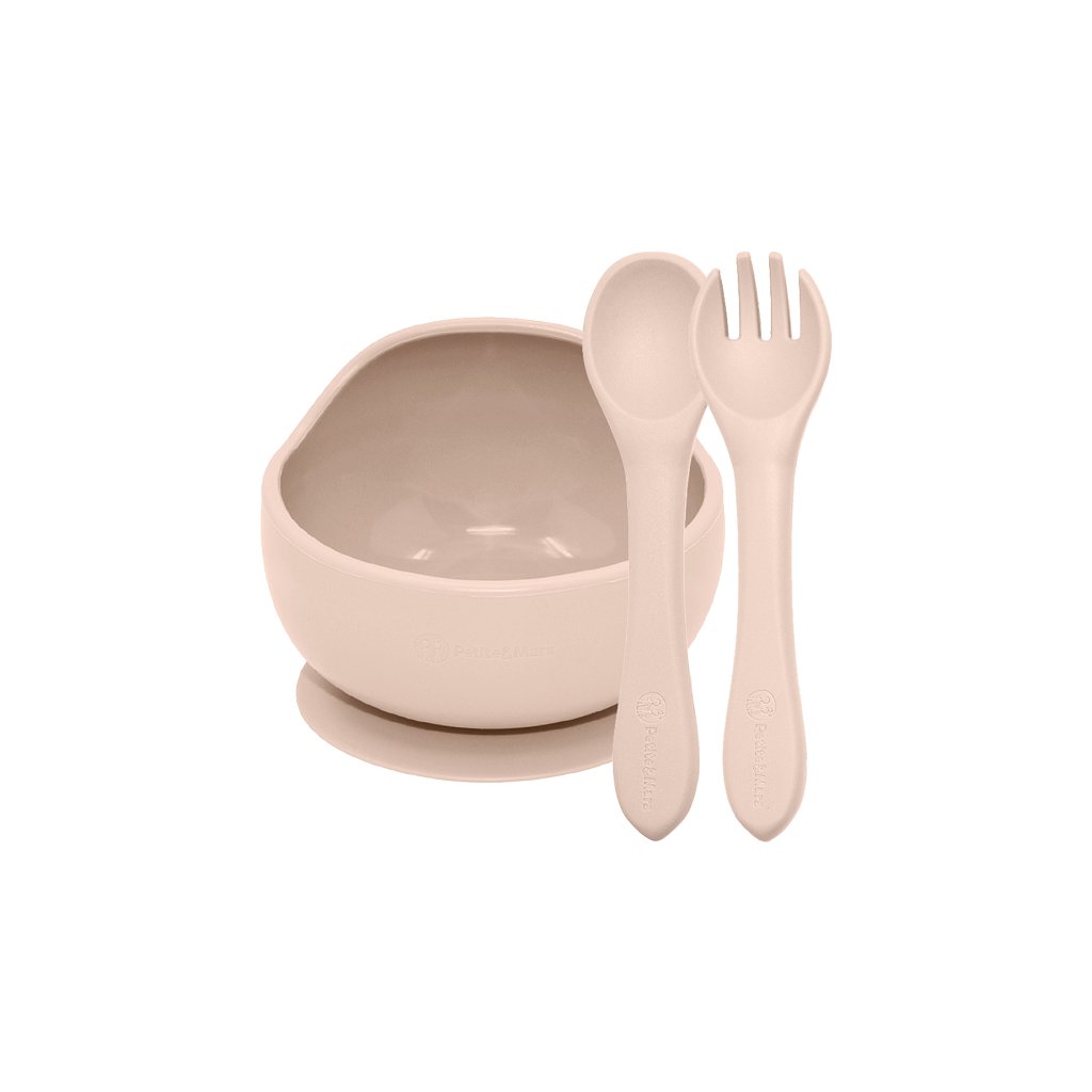 PETITE&MARS Set jedálenský silikónový TAKE&MATCH 2 ks miska + príbor Desert Sand 6m+