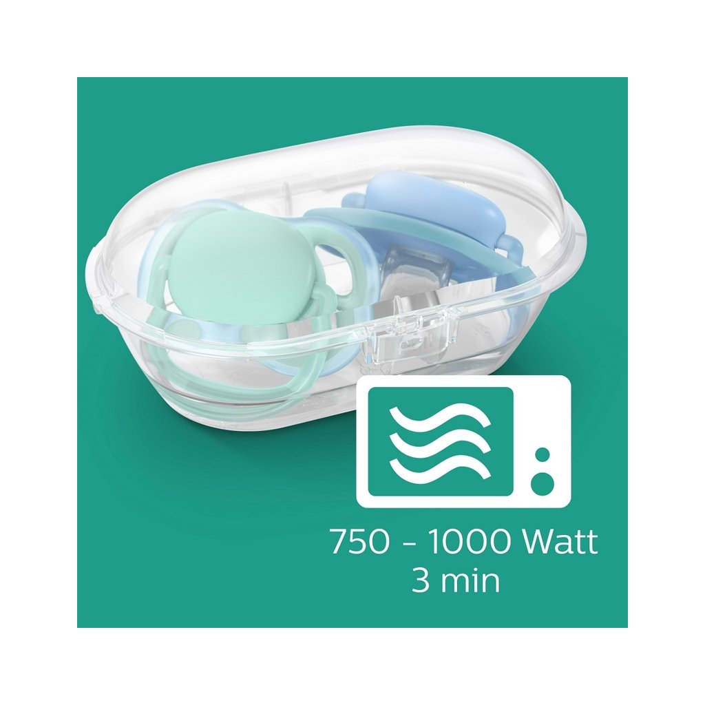 - Sterilizátor / obal na prenášanie umožňujú sterilizovať cumlík vášho dieťaťa v mikrovlnnej rúre a nosiť ho so sebou.