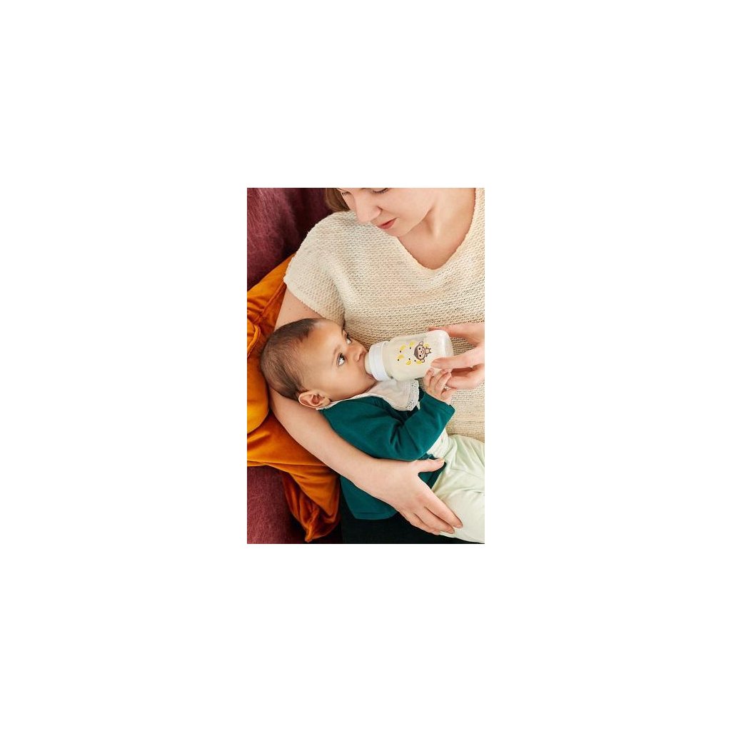 Tvar fľaštičky zaisťuje vysokú stabilitu a pohodlné držanie. Široké hrdlo uľahčuje plnenie fľaštičky aj jej čistenie. Prehľadná presná stupnica pomôže určiť, koľko vaše dieťa vypilo. Viečko tesne prilieha k cumlíku, takže pri premiešavaní stravy alebo cestovaní nedochádza k vylievaniu obsahu fľaštičky.
