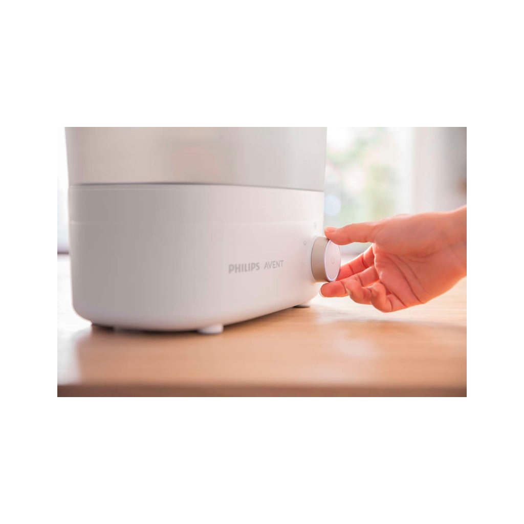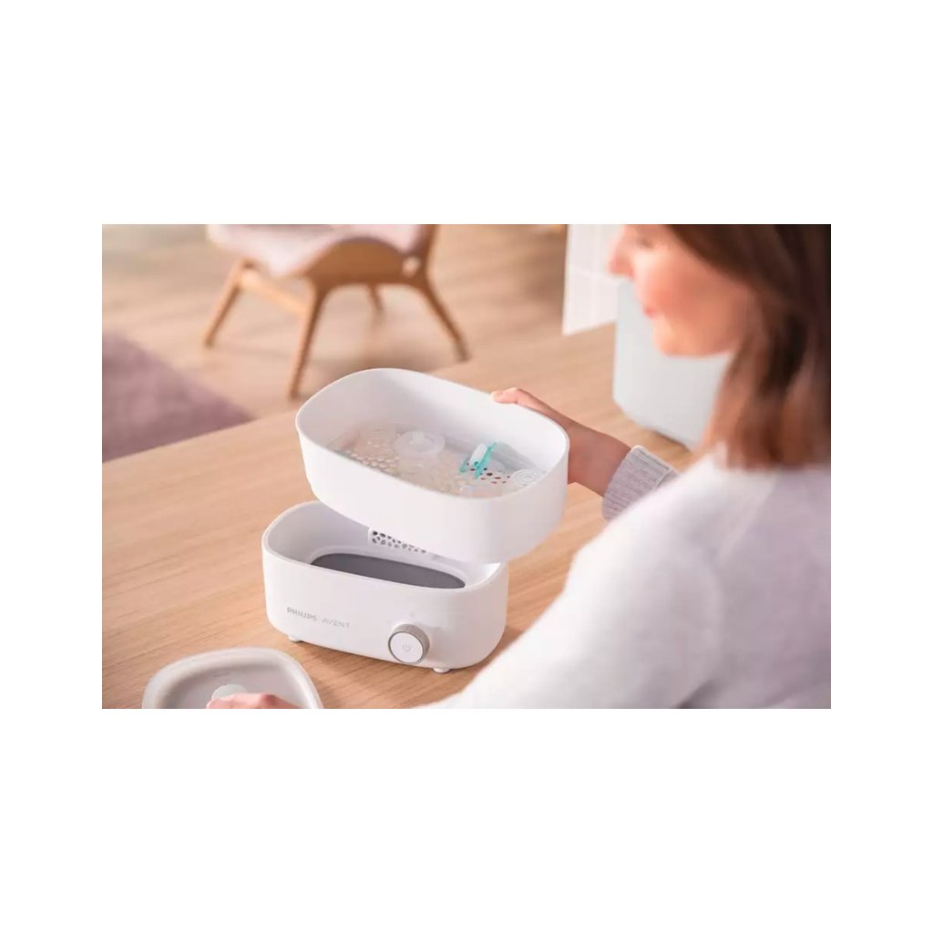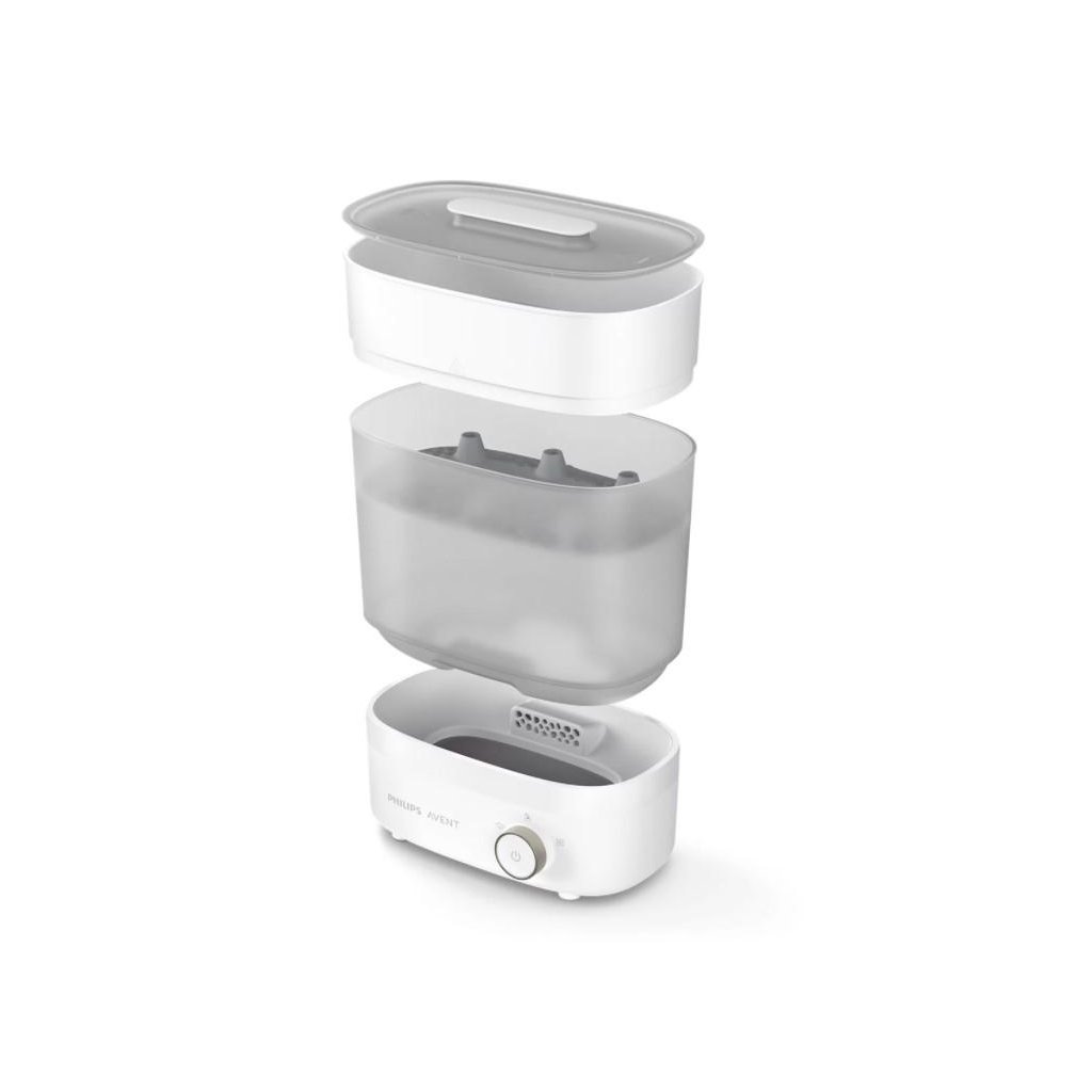 Vďaka prispôsobiteľnej veľkosti zaberie elektrický parný sterilizátor Philips AVENT v kuchyni minimálne množstvo priestoru a súčasne sa dokonale hodí pre predmety určené na sterilizáciu – či už je ich len zopár, alebo celá kopa.