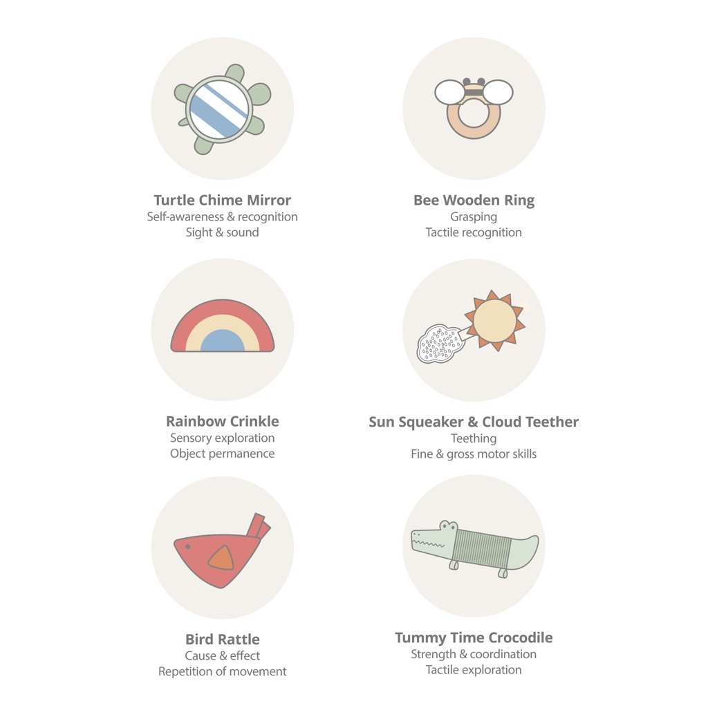 - 5 zavesených hračiek pre interaktívnu zábavu: zvoniaca korytnačka so zrkadlom na bruchu, drevená včielka s látkovým telom, vtáčik s rolničkou, šuštiaca dúha, pískacie slniečko s hryzačkou v tvare obláčika