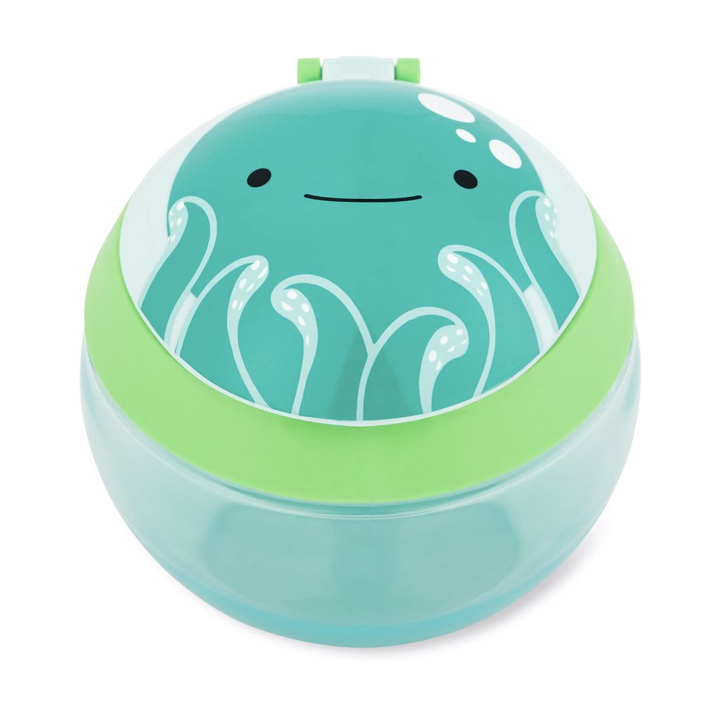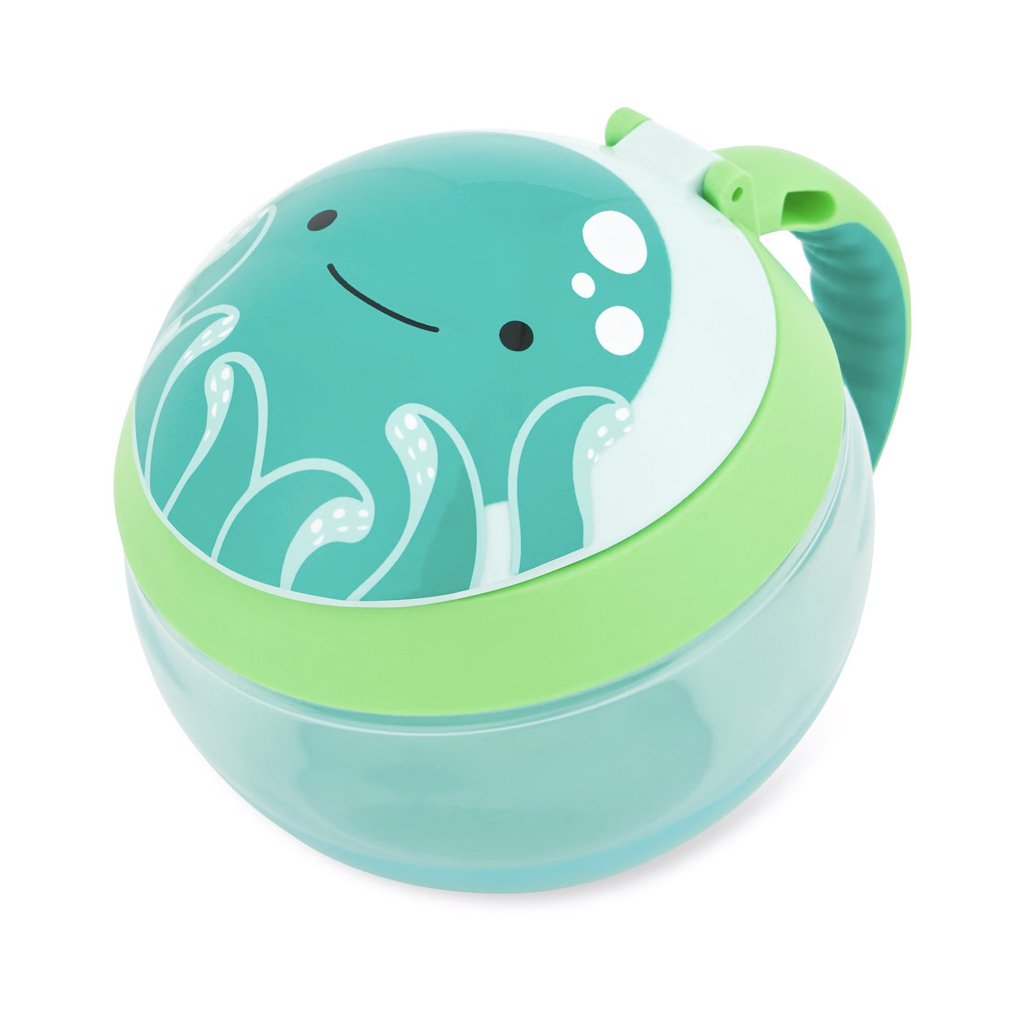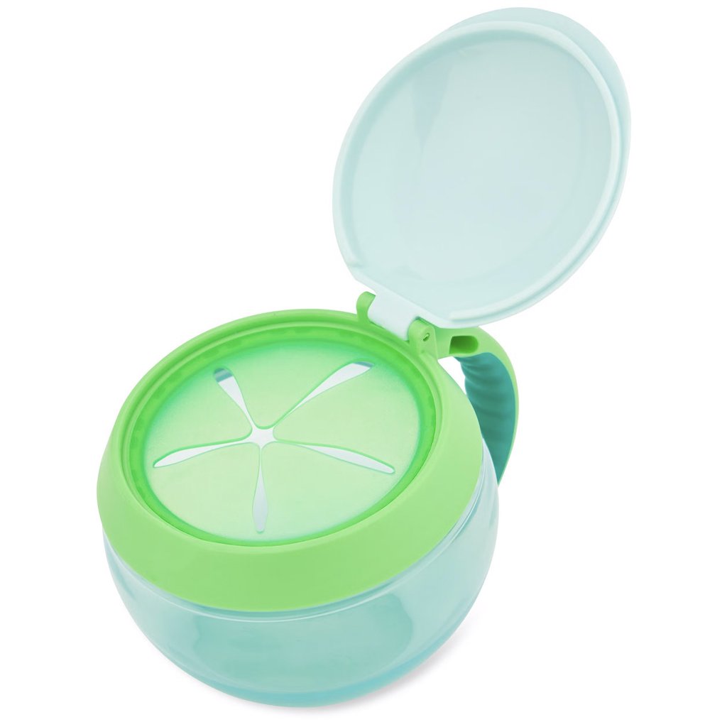 Šikovný nápad na cesty. Nádoba má viečko, ktoré po otvorení drží, pred vysypaním obsahu ho chránia pružné lamely, ktoré pustia detskú ručičku dovnútra, ale nepustia desiatu von. Nádoba je priehľadná, aby sa mohla zavčasu doplniť. Na boku je praktické uško v detskom rozmere, pomocou ktorého možno nádobu pripevniť aj na kočík či tašku. 0% BPA, 0% PVC, bez ftalátov. Obsah: 222 ml. Priemer: 10 cm