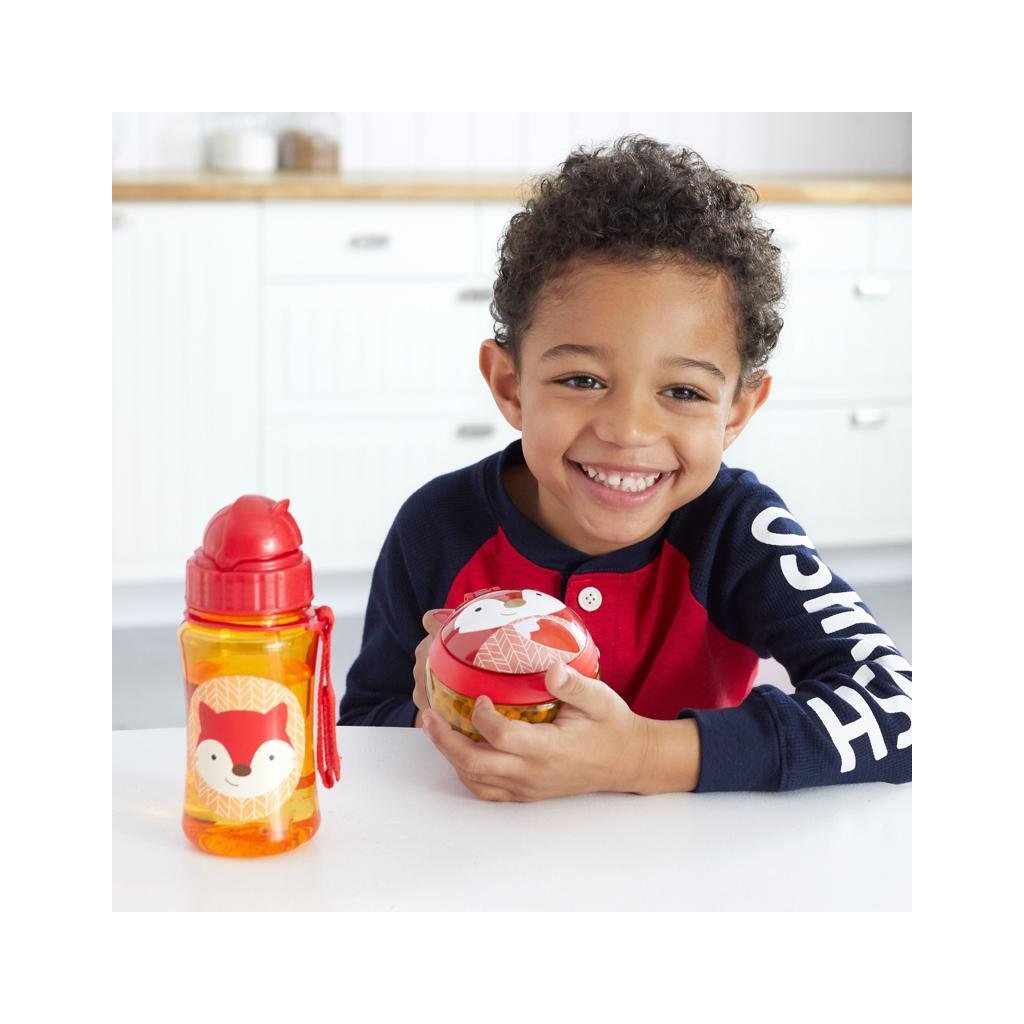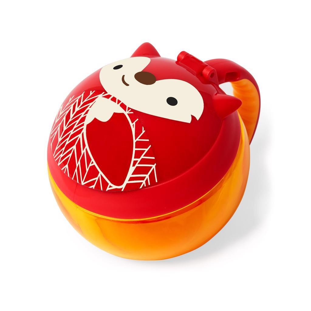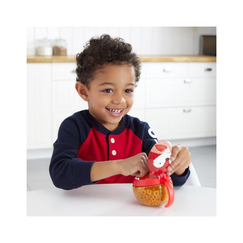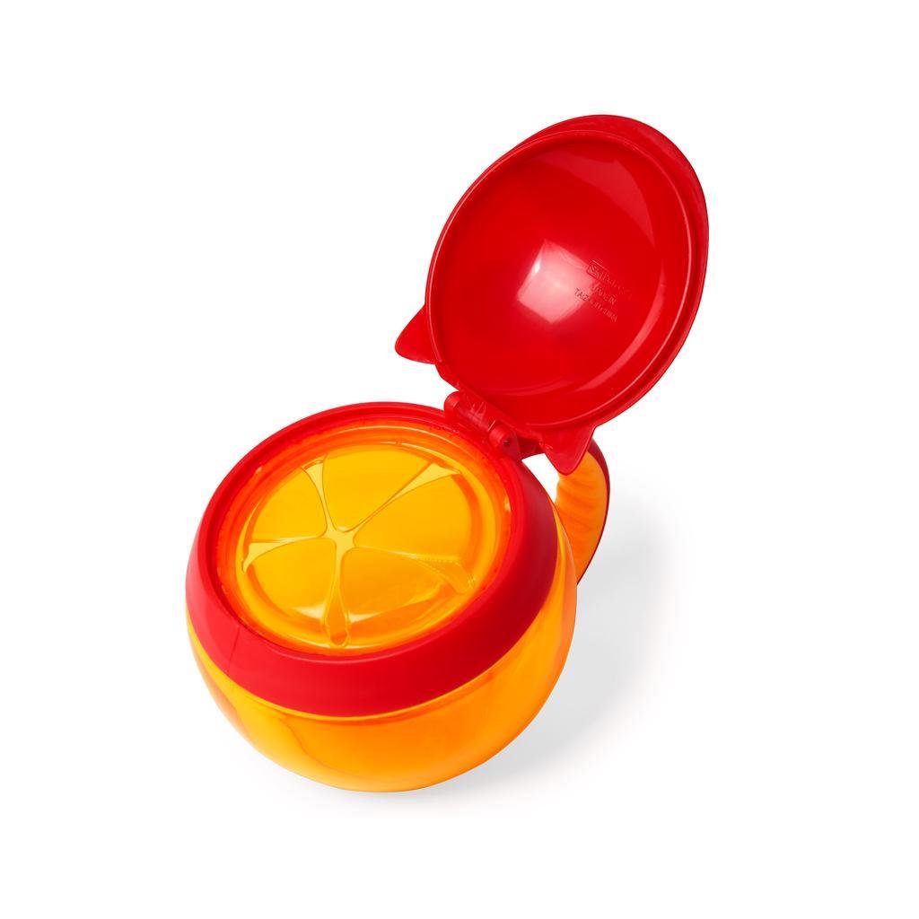 Šikovný nápad na cesty. Nádoba má viečko, ktoré po otvorení drží, pred vysypaním obsahu ho chránia pružné lamely, ktoré pustia detskú ručičku dovnútra, ale nepustia desiatu von. Nádoba je priehľadná, aby sa mohla zavčasu doplniť. Na boku je praktické uško v detskom rozmere, pomocou ktorého možno nádobu pripevniť aj na kočík či tašku. 0% BPA, 0% PVC, bez ftalátov. Obsah: 222 ml. Priemer: 10 cm