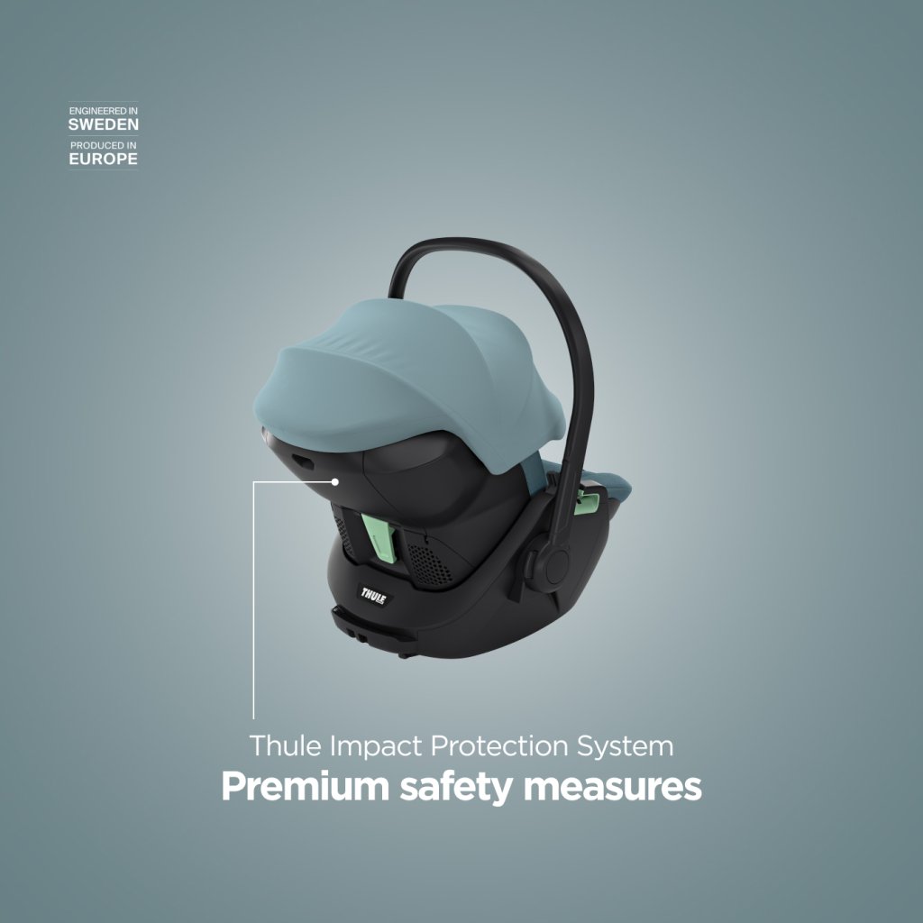 Pre bezpečie a ochranu dieťaťa sú v sedačke vstavané 3bodové bezpečnostné popruhy a Thule Impact Protection System. Na rozdiel od iných modelov je náš systém trvalo súčasťou produktu, takže ho nemožno zabudnúť nainštalovať