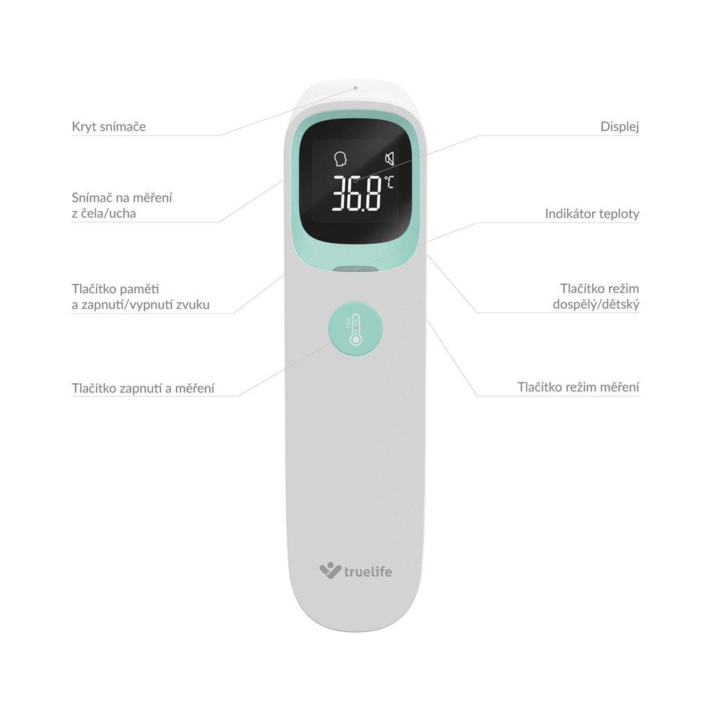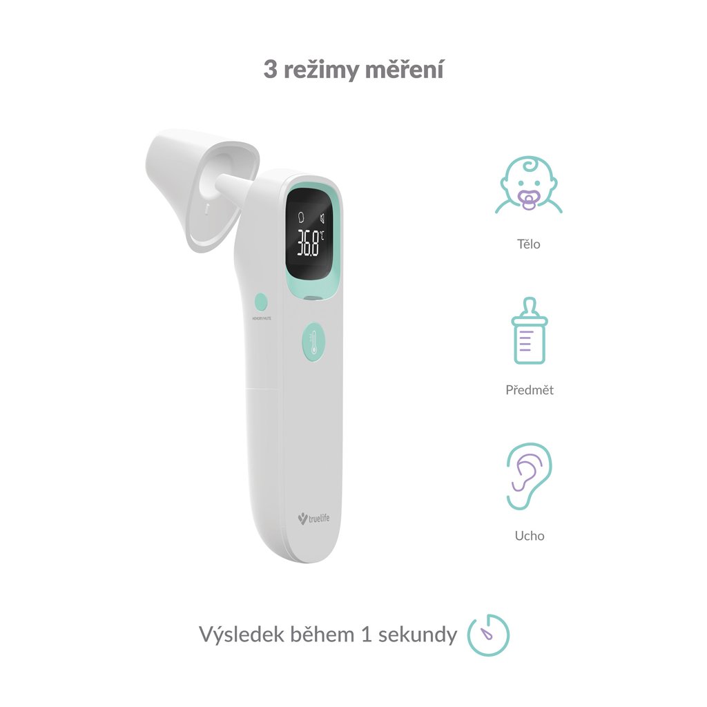 TrueLife Care Q10 BT ponúka tri režimy merania teploty. Okrem klasického merania telesnej teploty dokáže zmerať aj predmety, povrchy alebo tekutiny. Ľahko tak môžete skontrolovať napríklad dojčenskú stravu alebo čaj. Pri meraní telesnej teploty osôb máte možnosť voľby medzi meraním z teploty z ucha alebo čela. Teplomer disponuje aj detským režimom, ktorý je prispôsobený pre osoby mladšie ako 12 rokov.