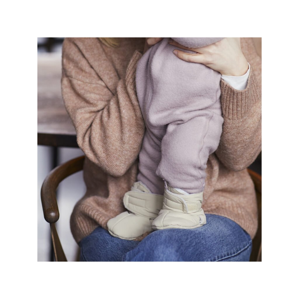 Topánočky sú vyrobené z prírodných a kvalitných materiálov. Výplň je zo 100% ovčej vlny, ktorá zaisťuje príjemnú teplotu a odvádza vlhkosť od bábätka.