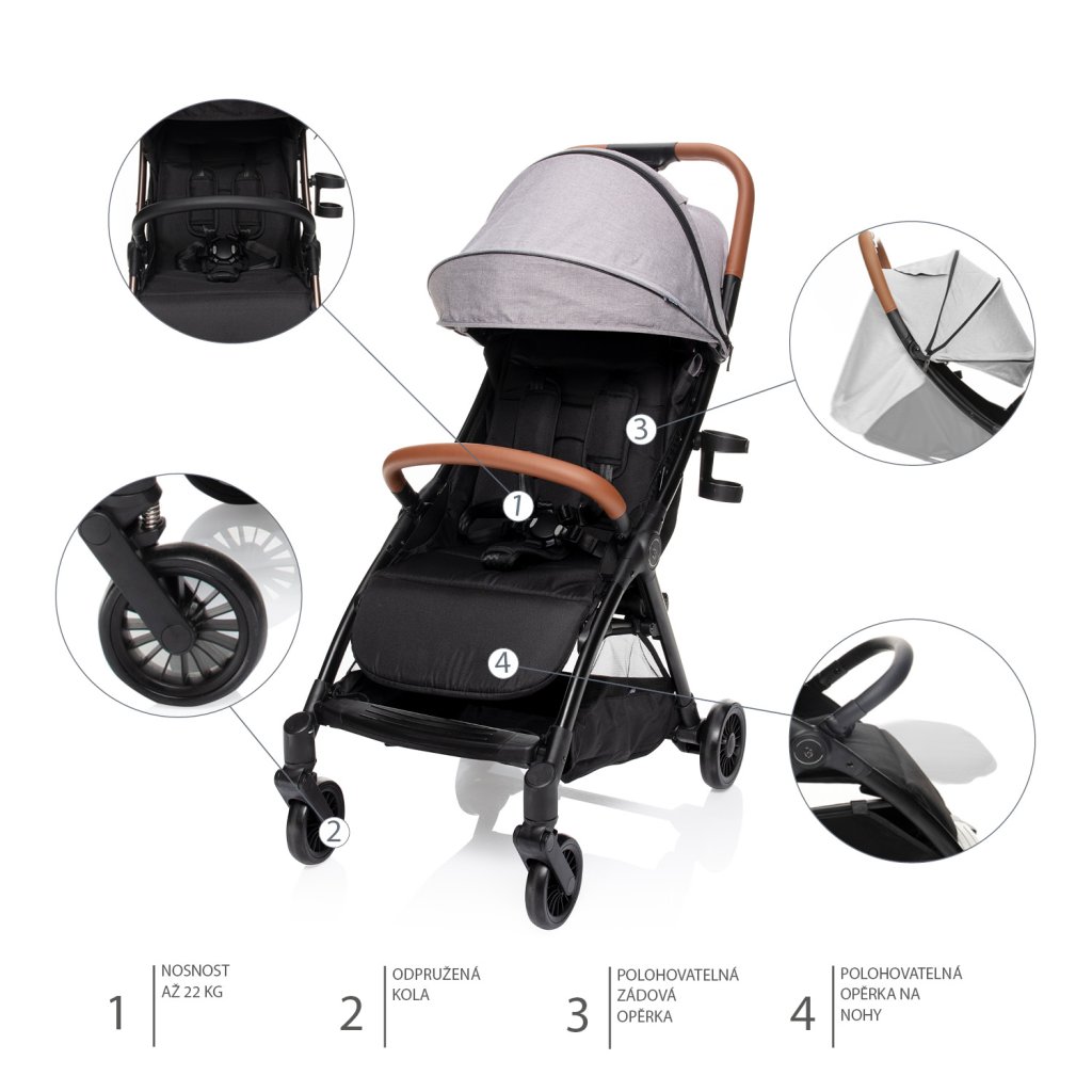 22 kg. Odpružené kolesá zvládnu prechádzky v prírode aj po dlažbe v mestách.