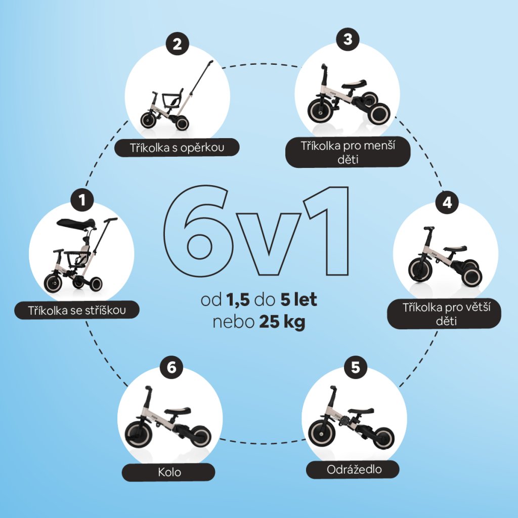 Vďaka šikovnej konštrukcii je možné jednotlivé časti ľahko odobrať alebo prestavať – bez potreby náradia. Prechod z trojkolky na odrážadlo či bicykel je otázkou niekoľkých minút. Trojkolka má navyše kompaktné rozmery, takže sa bez problémov zmestí do kufra auta a je vhodná aj na cestovanie.